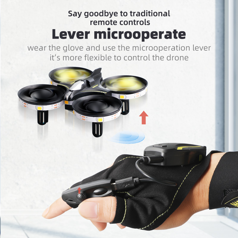 2.4G GLOVE SENSOR DRONE 1- Fly time: 5-6 mins,2- Charging Time: about 50mins,3- Control distance: 30-40M,4- Drone battery: 3.7V 200mAh rechargeble Li-po battery (included),5- Glove Battery: 1.5V AAA x 2 battery (not included),6- Accessory: USB charger x 1, manual x 1, blader x 4,7- Product size: 8x8x3.3cm,8-Function:forward / backward, slip left / right, trun left / right, up / down altitude hold, take off / landing,3D flipping, LED light, Glove sensor control