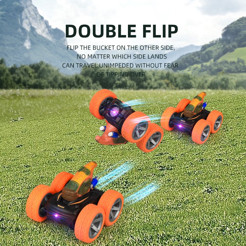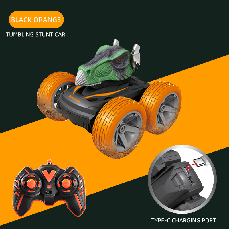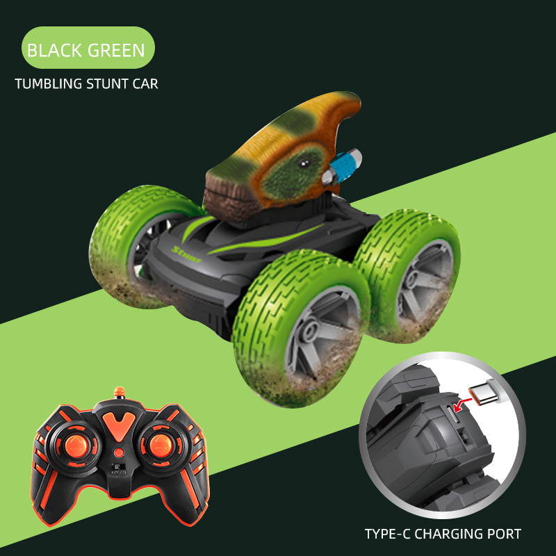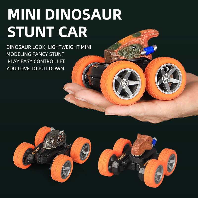 2.4G MINI FOUR WHEEL DOUBLE SIDE DINOSAUR STUNT CAR 1- Play time: 15-20 mins,2- Charging Time: about 60 mins,3- Control distance: 15-20M,4- Car battery: 3.7V 300mAh rechargeble battery (included),5- Remotor Battery: 1.5V AAx2 battery (not included),6- Accessory: USB charger x 1,7- Product size: 9.5x 9 x 8cm,8-Function:2.4G,go forward/back,turn left/right,360 spins