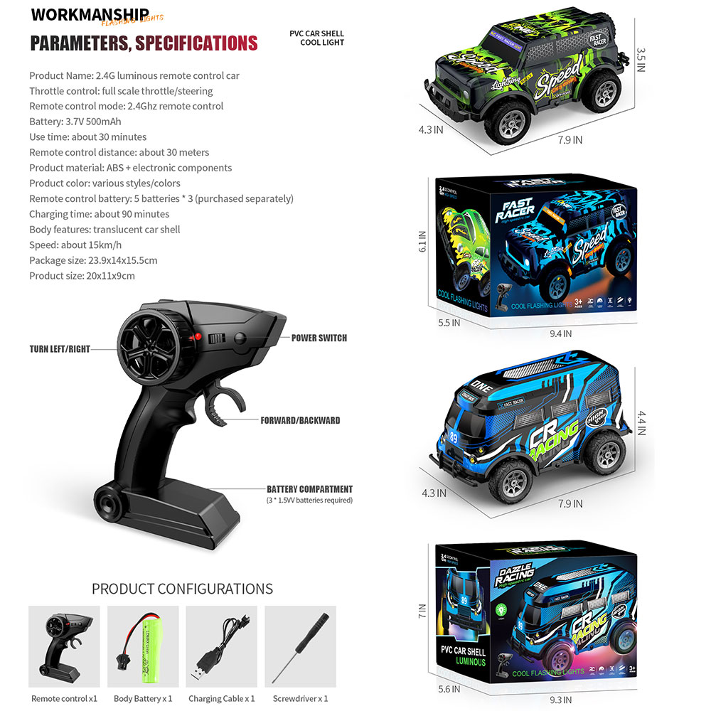 Remote control mode: 2.4Ghz remote control Battery: 3.7V 500mAh Use time: about 30 minutes Remote control distance: about 30 meters Remote control battery: 3*AA(not including ) Charging time: about 90 minutes Body features: translucent car shell Speed: about 15km/h