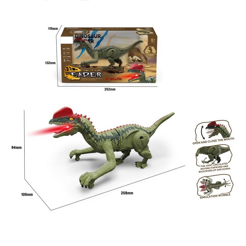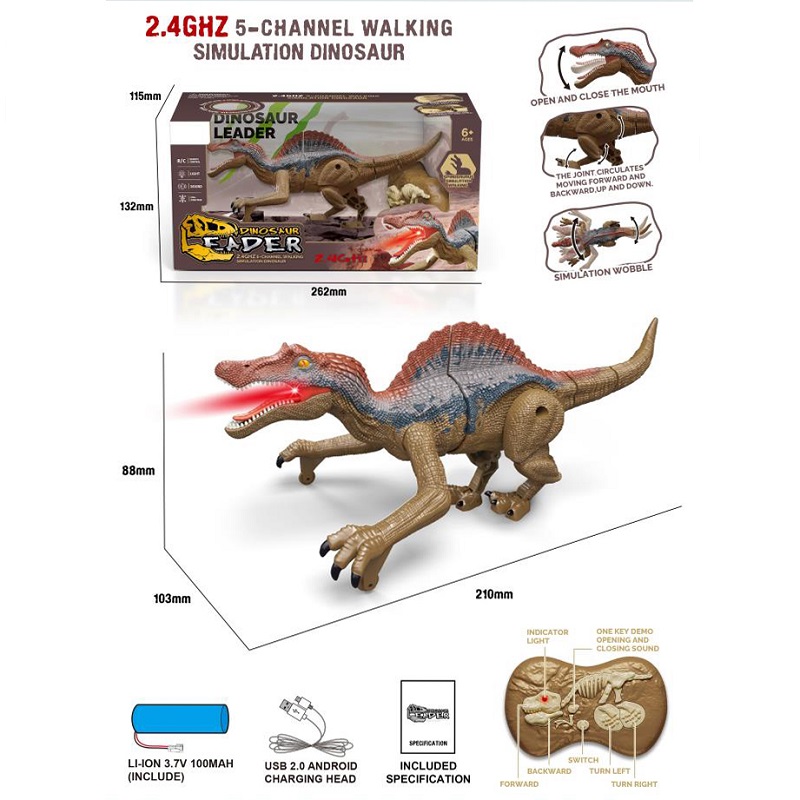 With light & sound; 3.7V 100mAh (rechargeable USB Android port & USB cable); Remote control 2*1.5V AA not included; Forward, backward, body swing from side to side, remote control one-button demonstration, yelling, low sleep, sound footsteps synchronization, simulation 3D eyes; One button of the head is pressed to turn on the machine, and two buttons can be pressed to wake up and display the pace swing, sound and light; Long press off