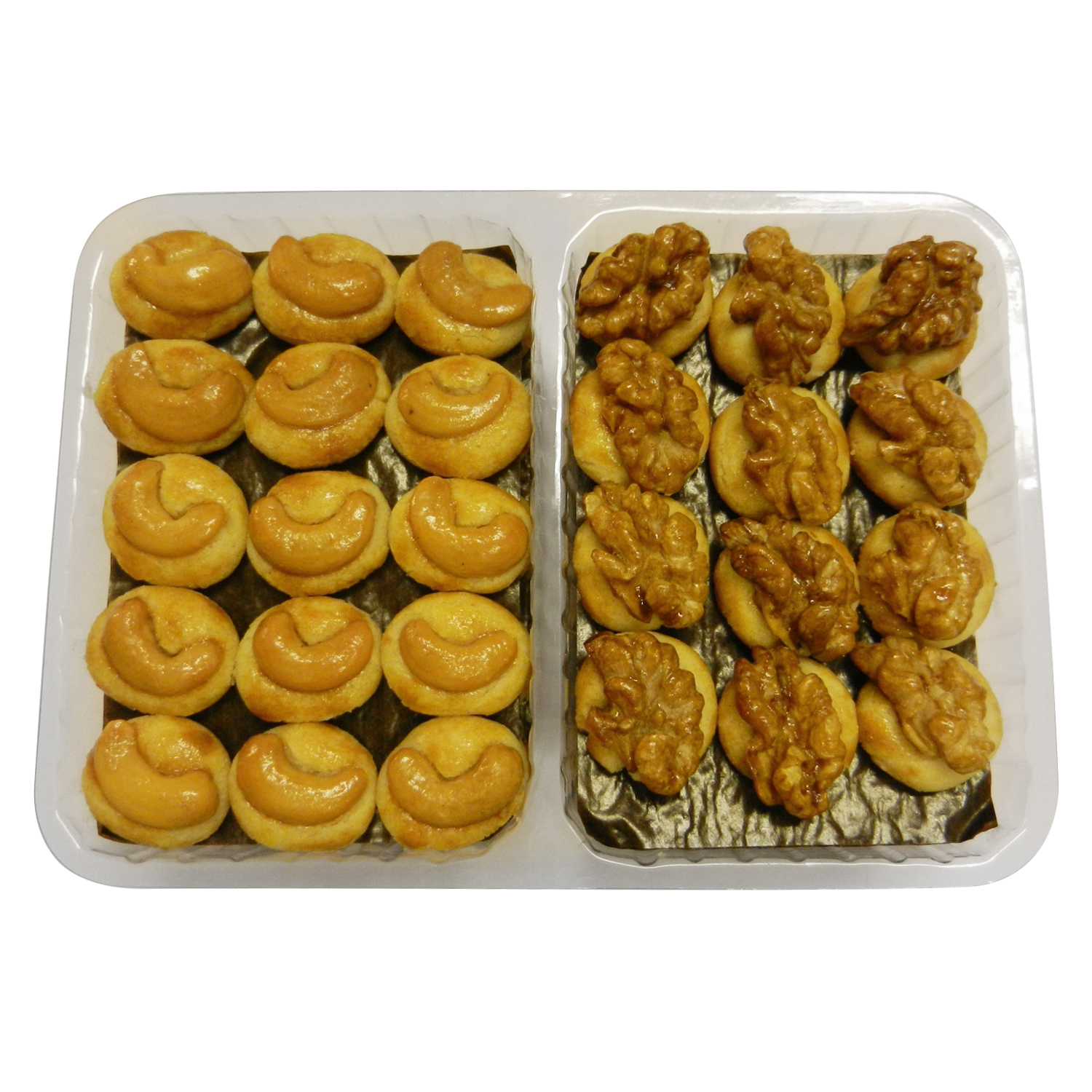 For Cashew Nut Cookies, there are four layers and for Walnut Cookies, there are three layers with 12 to 15 bite-size shortcakes on each layer, depending on the size of each shortcake.