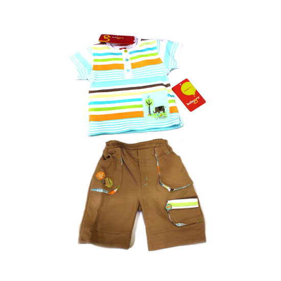 This is a 2-piece baby wear set including a polo shirt and a pair of pants with a matching design. The allover striped patterns highlight this polo shirt. This elastic waistband and multiple pockets complete the pants.