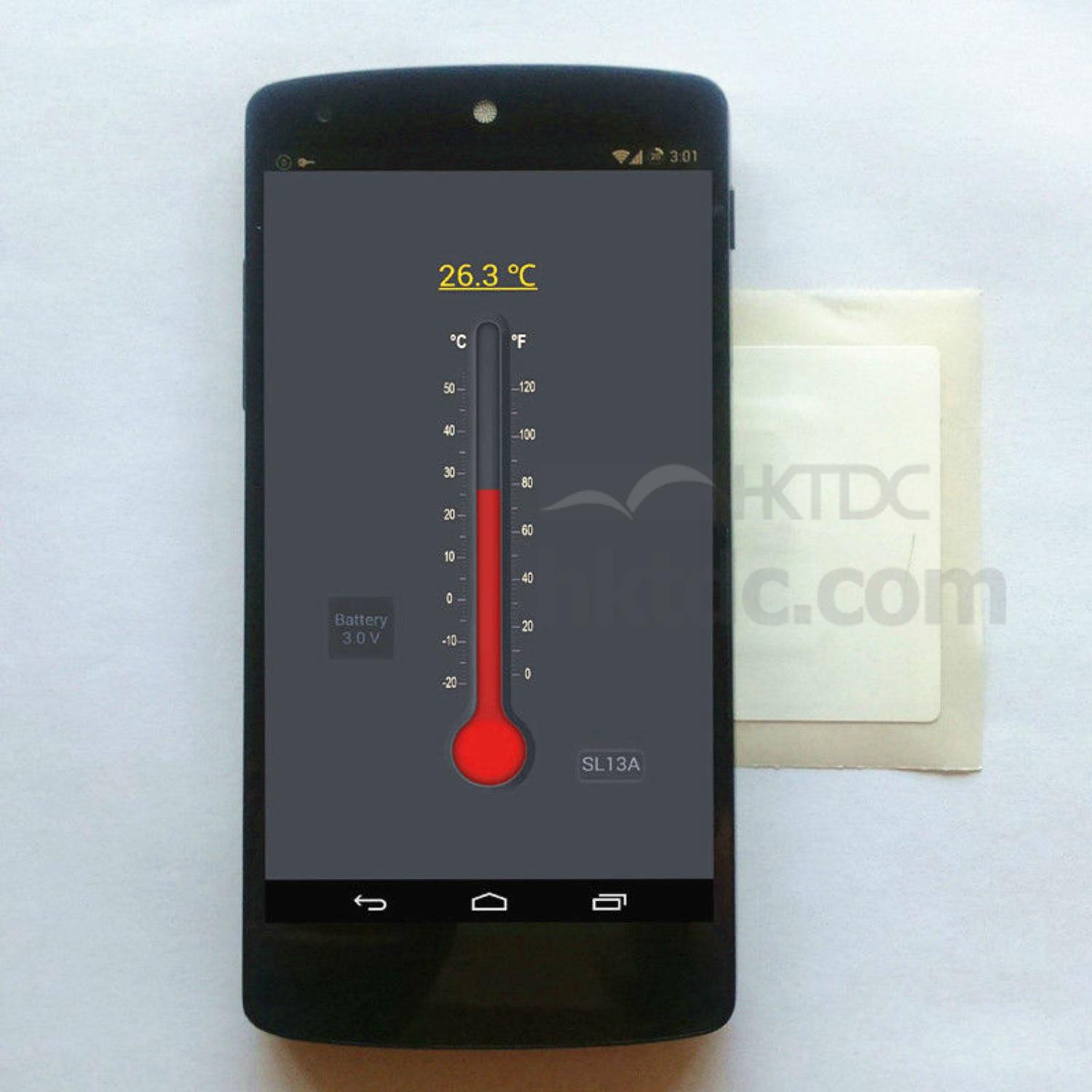 SA13A Tag is a ISO15693 compatible RFID tag with a temperature sensor and an extra-thin paper battery inside, the embedded IC is SL13A designed by AMS, and the SL13A chip has a fully integrated temperature sensor with a maximum accuracy of 0.5ºC. The SL13A tag is ideal for temperature monitoring, you can make use of your Android phone (NFC enabled) to set the log limits, log mode and log delay time of the SL13A tag. The tag can keep logging the temperatures data for more than two months in dense mode if the log interval is set to 120 minutes.