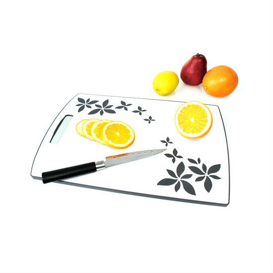 This two-toned cutting board makes it easier for you to prepare your ingredients with its non-slip surface. The cutting board is made of quality silicone and will not absorb odors. The cutting board features die-cut details for a lovely touch.