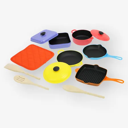 This is a kids' cookware set coming with 12 items, such as a frying pan, a pot and lids. They feature a 2-toned appearance and vents are also designed on the lid for a real look. This deluxe kids' cookware set is made of plastic for a long playing time.