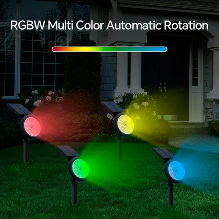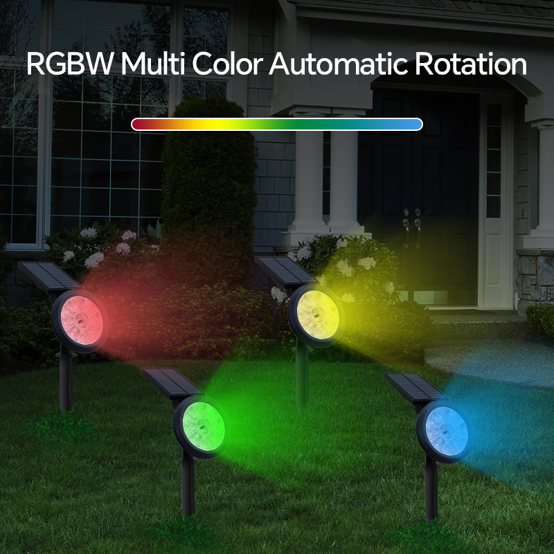 A.Button switch: When the solar panel is lower than 25LUX, turn it on and enter the RGBW mode, the color will automatically change, and the color will cycle through gradient in 5 seconds.