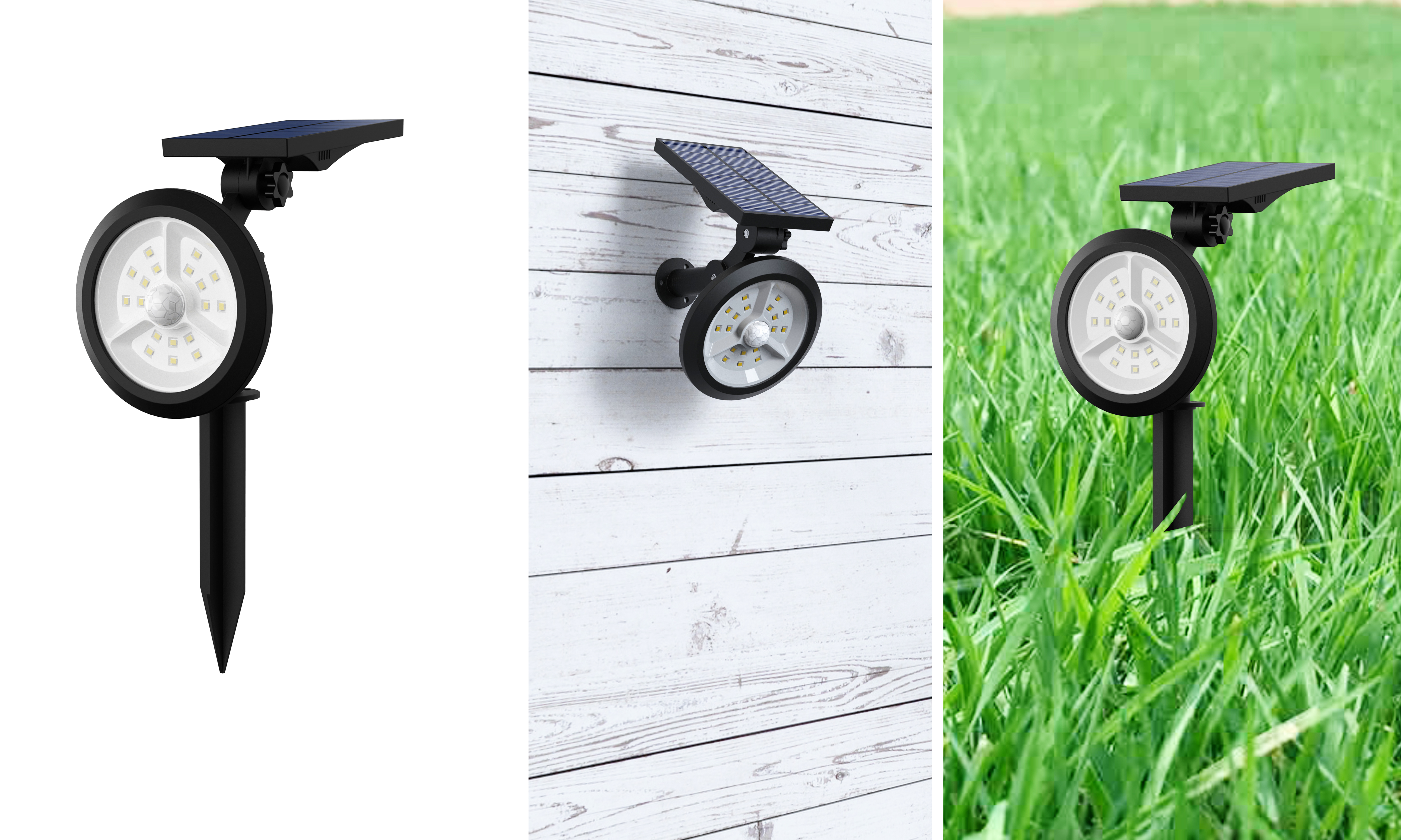 Here is our 2-in-1 outdoor solar light. You can use it as Solar wall lights but also a solar garden lights with rotating solar pannel and light head.