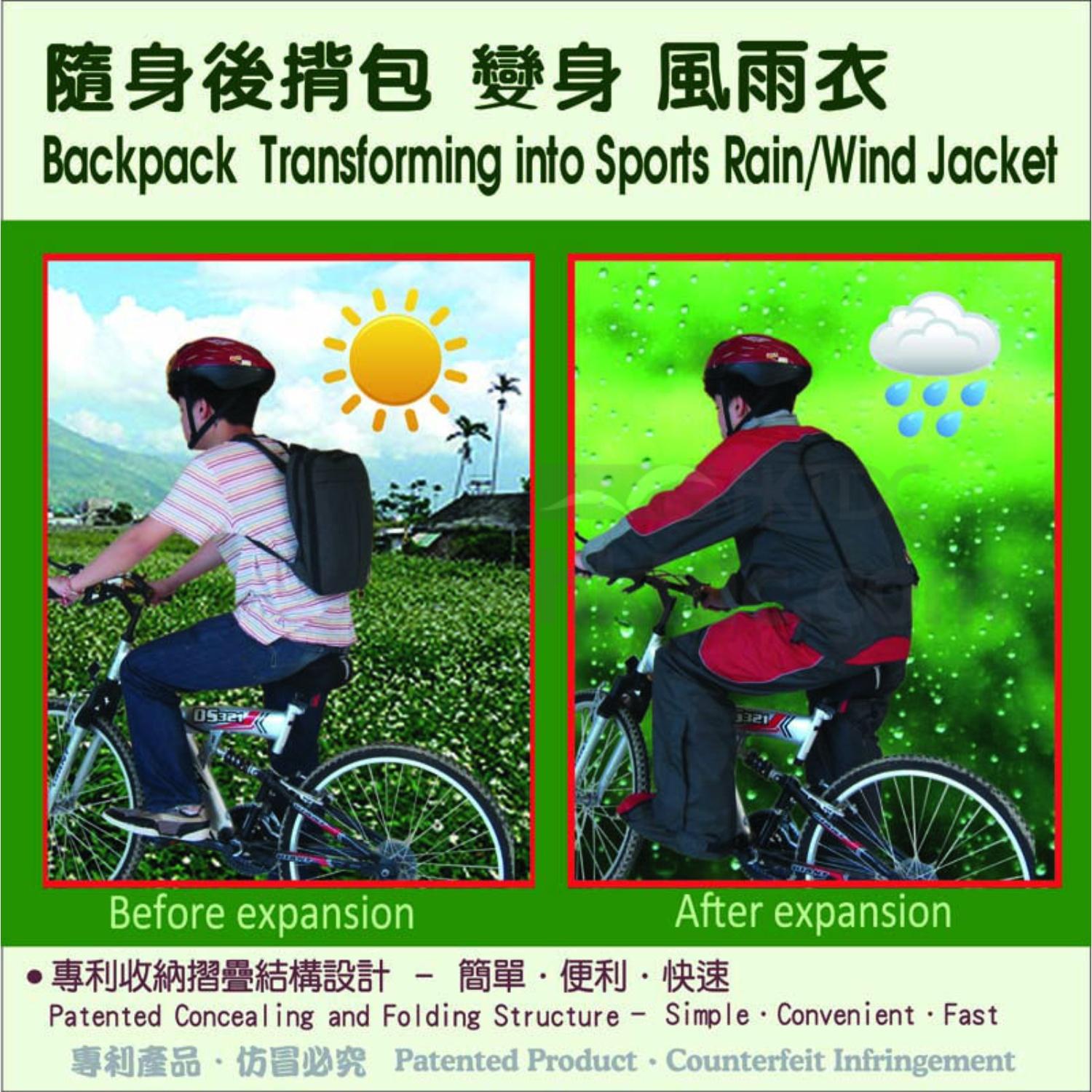 The product can be used as a normal waist bag, belted up on user's waist, on the chest or the back. When being used as a normal waist bag, small belongings such as wallets, ID cards, passports can be placed inside the storing space of the waist bag. Whenever necessary, the waist bag can easily be unfolded and transformed into a Sports Rain/wind Jacket. After transforming into a Sports Rain/ wind Jacket, user can still have an access to get his/ her small belongings by entering from the opening of the Jacket's side pocket.