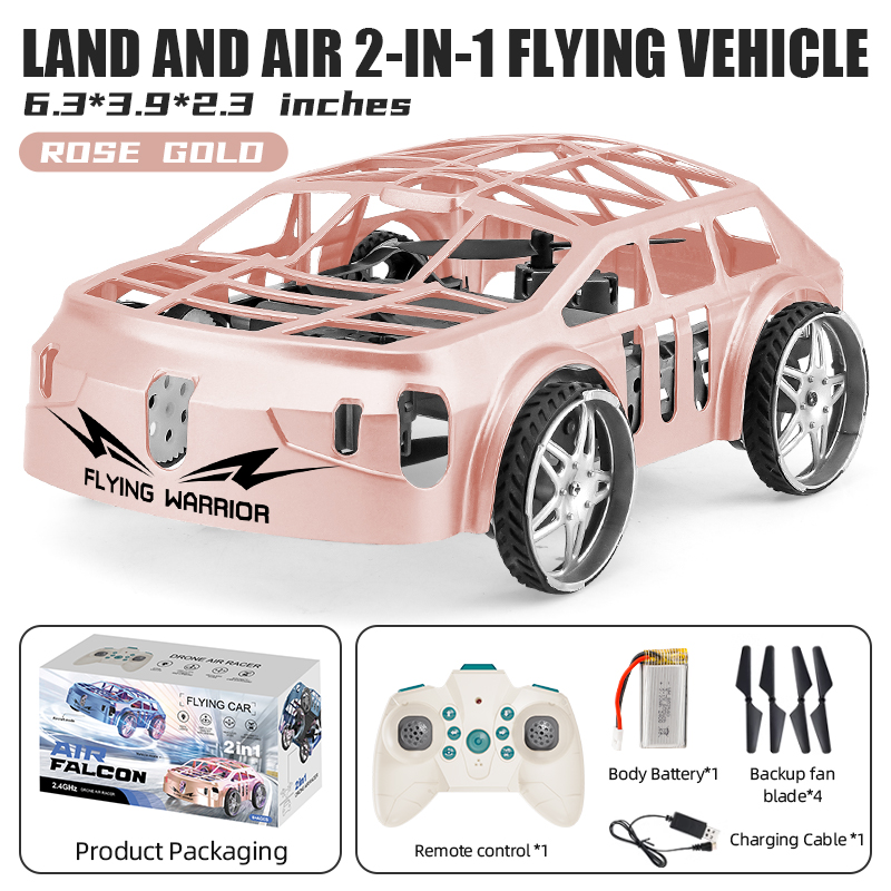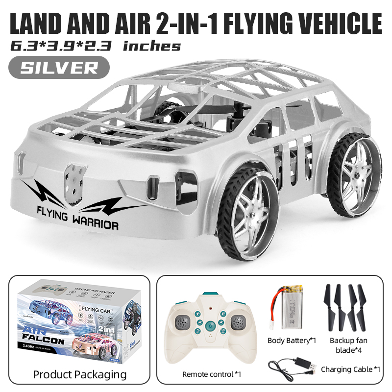 2 in 1,can be flying drone,can be racing car. car battery: lithium battery remote control distance :about 30 meters product material: abs+electronics battery life : approx. 5 minutes approx. 30 minutes in 2-in-1 mode charging time :about 80 minutes remote control battery: 1.5v aa*2(not included) precautionary note do not touch the fan blades when the vehicle is in use.