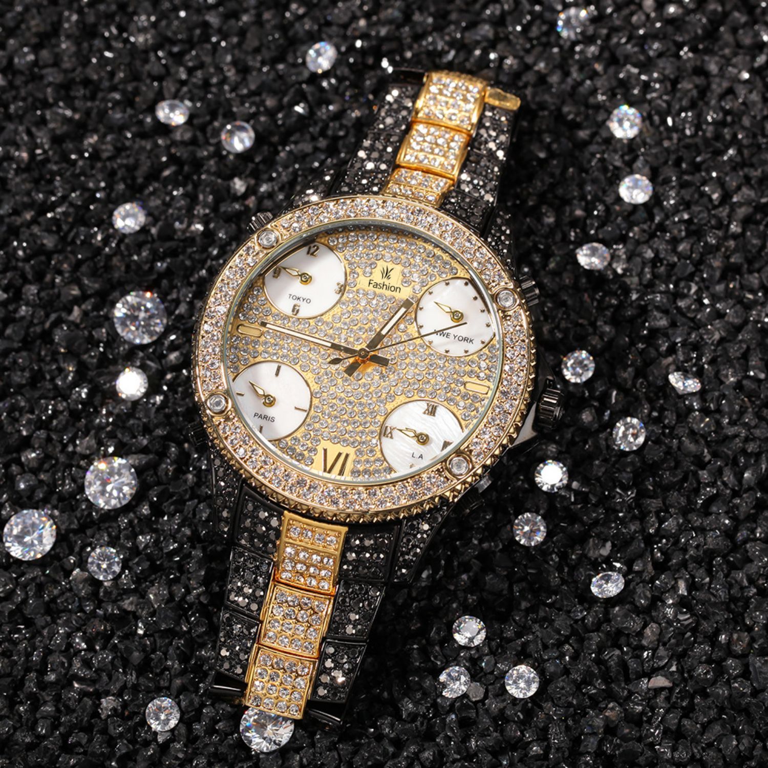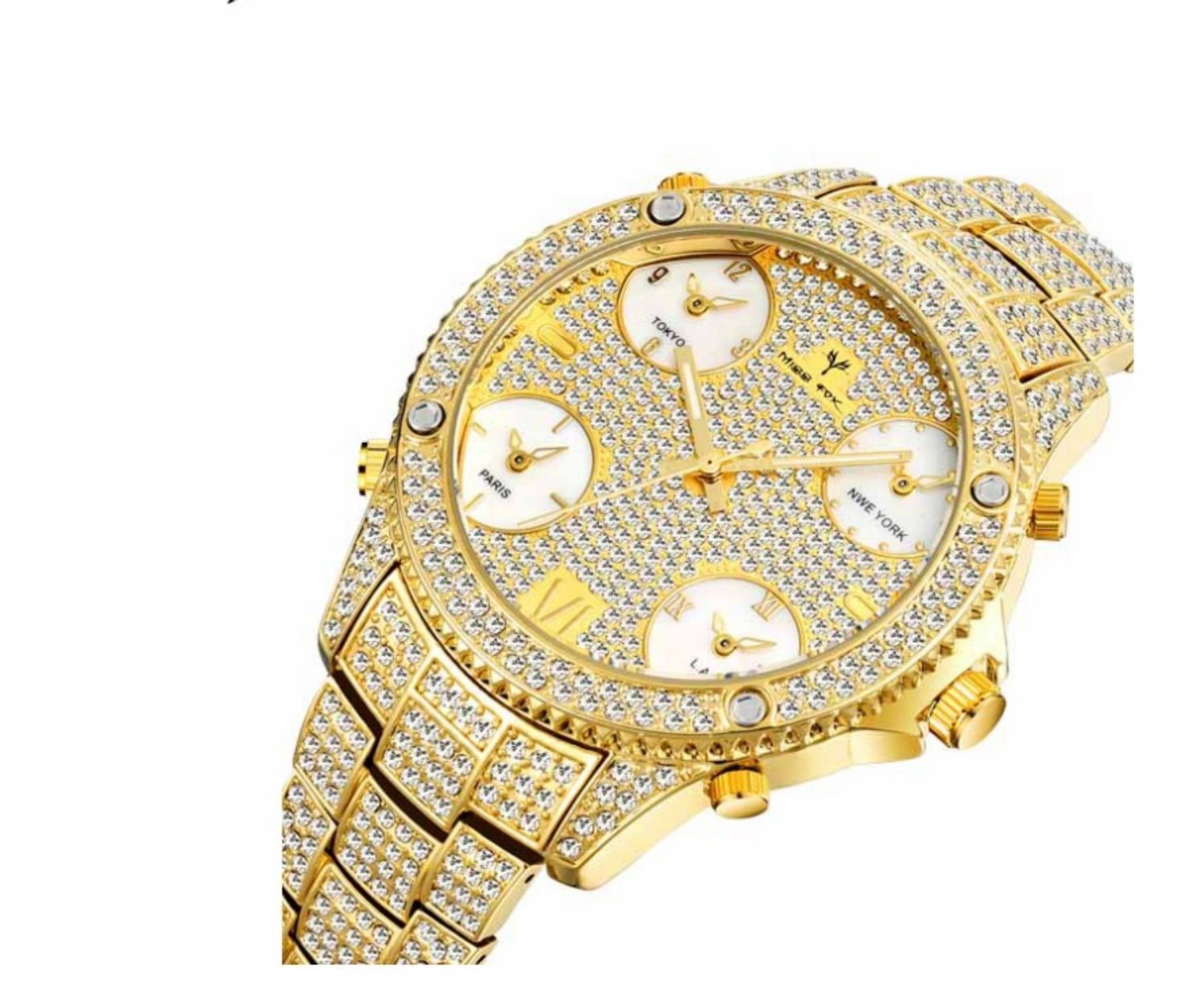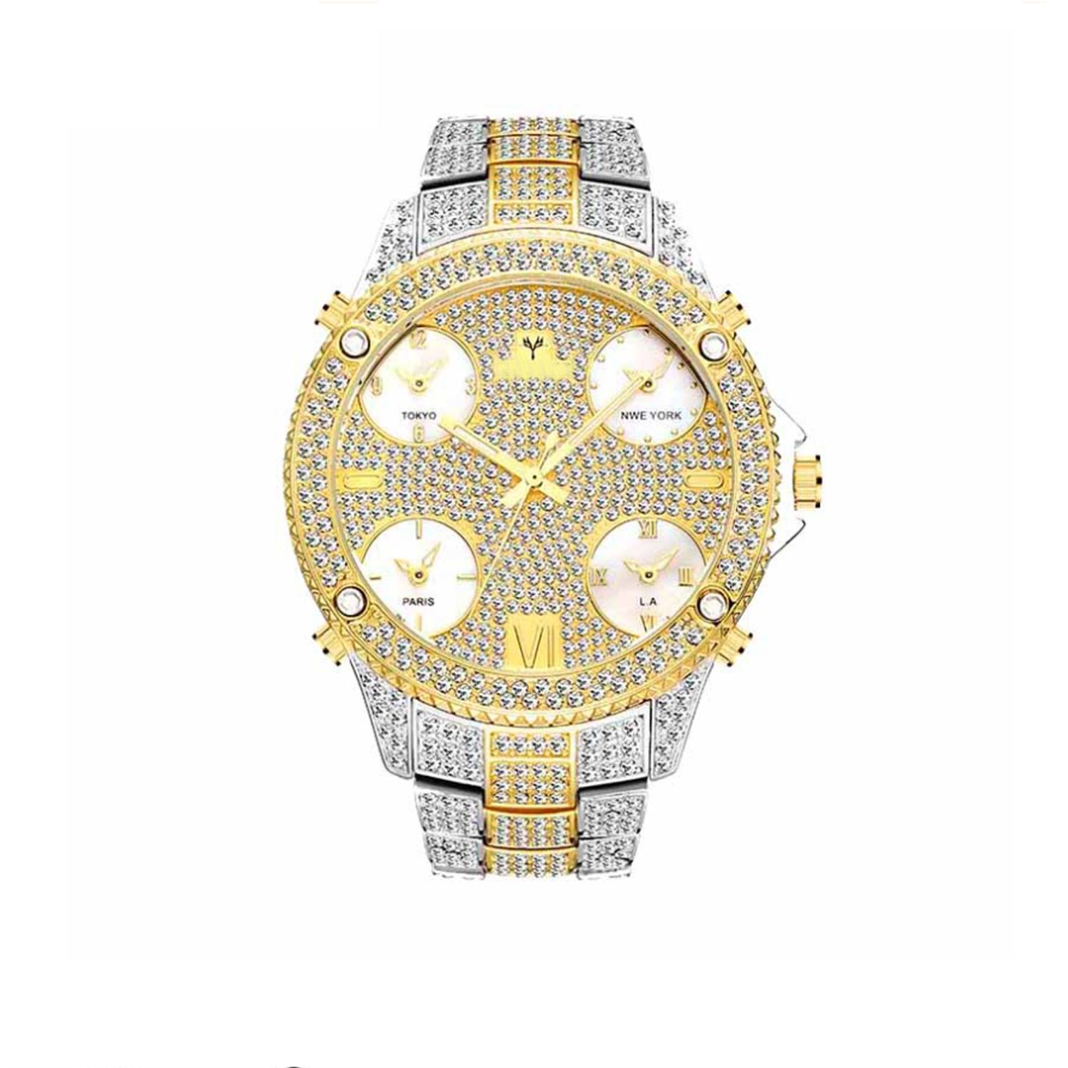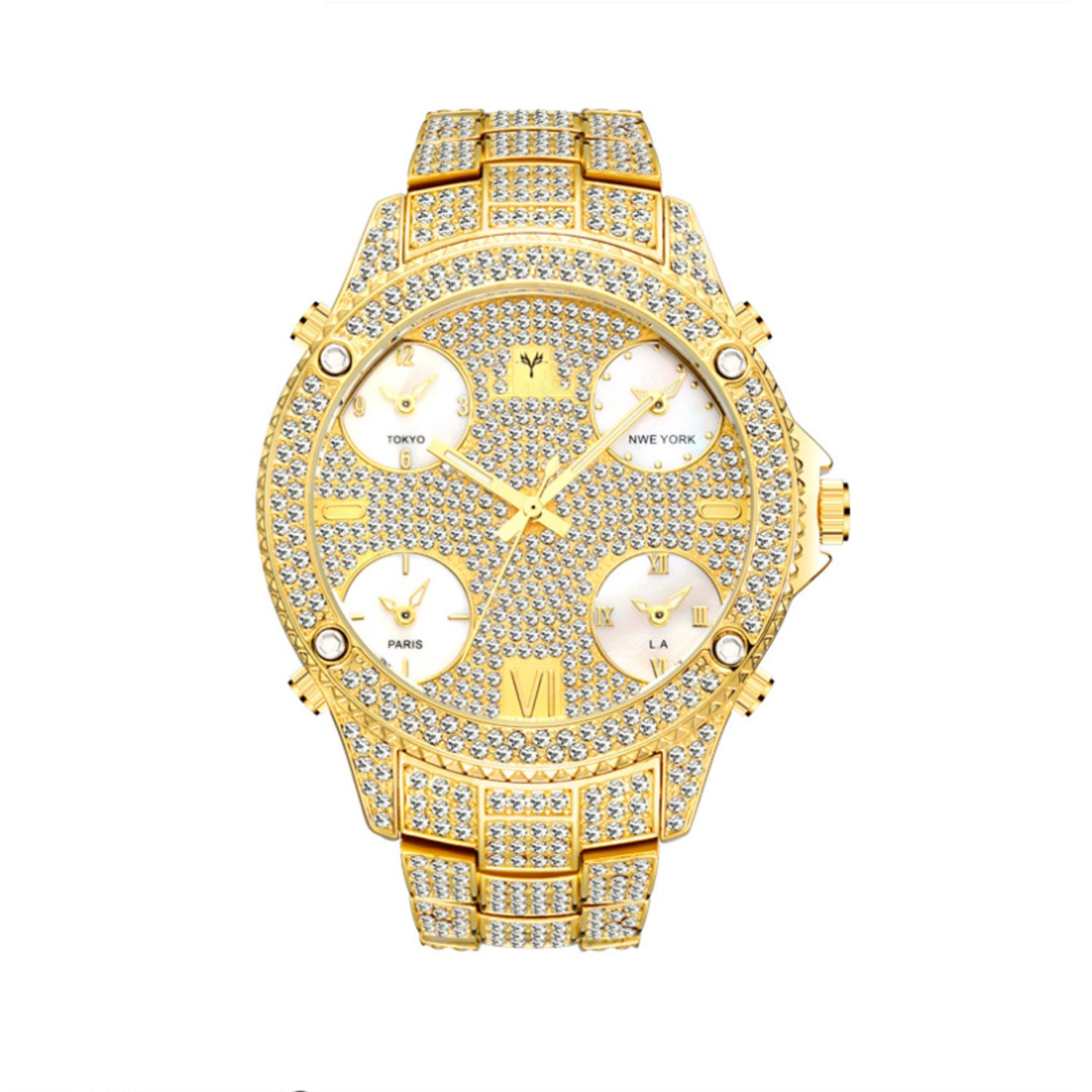 2021 New Hip Hop Full Rhinestone Cool Casual Sports Calendar Personality Fashion Quartz Watch With Four Time Zones