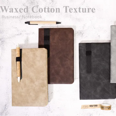 COVER: Waxed cotton texture PU combined with 1.5mm cardboard and pen loop design