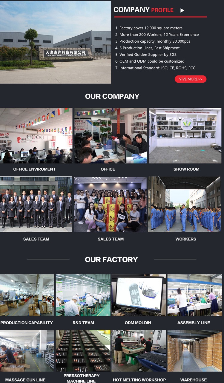 We have been in home health care massager and sports recovery filed for more than 10years. We have our own factory with 12,000square meters more than 100 skillful workers, yearly turn out about 360,000PCS. Our main products include pneumatic compression therapy system, air pressure foot leg massager, fasica massage gun and vibrating foam roller. We could offer one stop solutions for sports recovery.