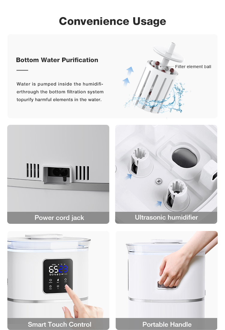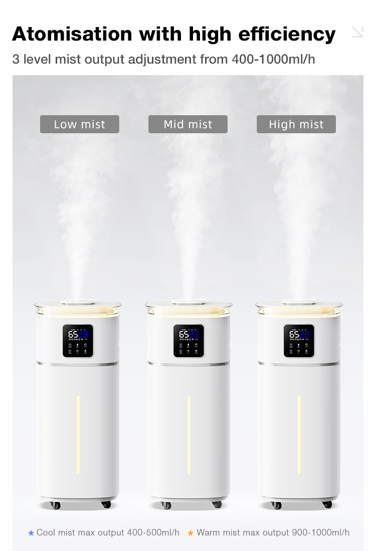 4) 3 level mist adjustment,cool mist 400ml/h-500ml/h;warm max mist output 900ml/h-1000ml/h;