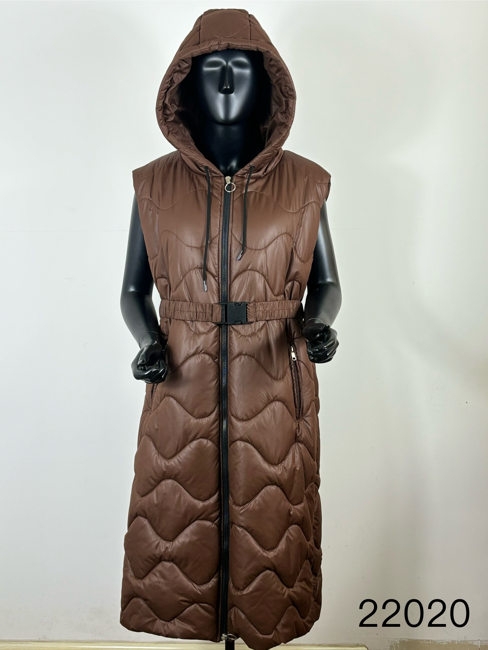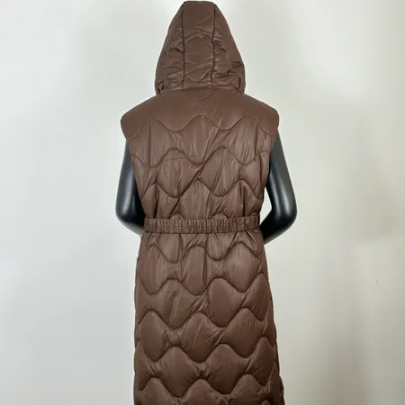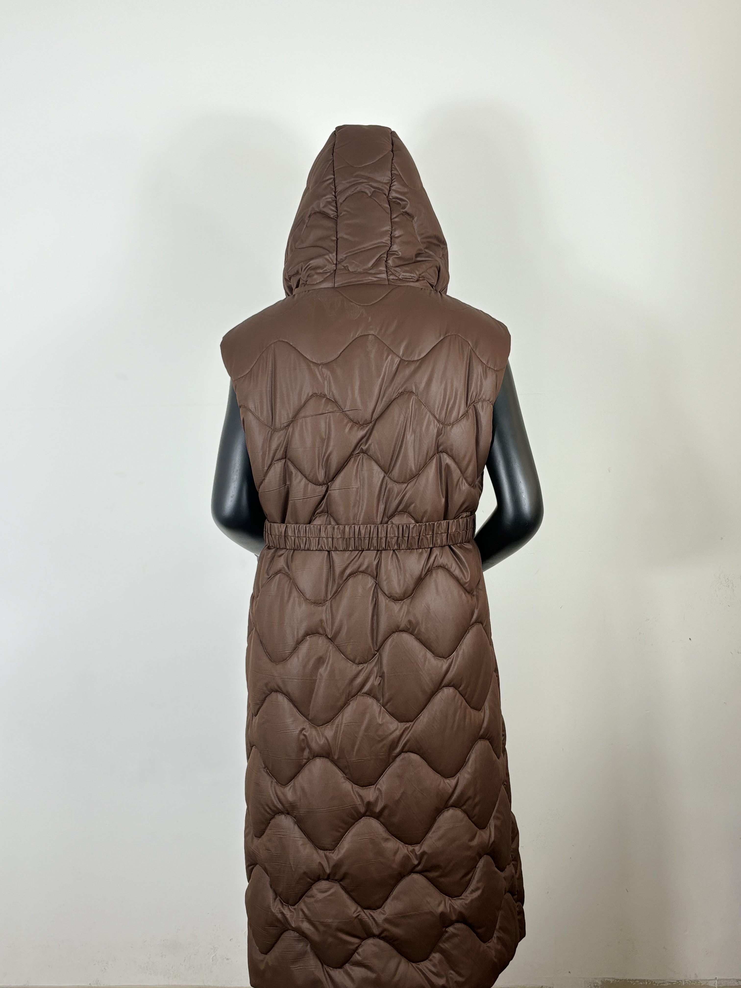 The image features a stylish sleeveless padding vest displayed on a mannequin. The vest is designed with a quilted pattern that adds texture and visual interest. It boasts a warm, earthy brown color that is versatile and easy to pair with various outfits. The vest includes a hood, providing additional warmth and protection against the elements. A front zipper allows for easy wear and removal, while a belted waist offers a flattering fit and the ability to adjust the silhouette. The mannequin is positioned against a simple background, ensuring the vest is the focal point of the image. This garment is ideal for layering during colder seasons, offering both comfort and a fashionable look.