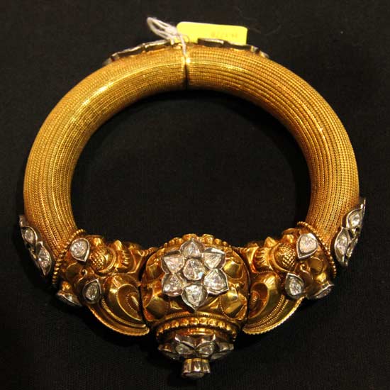 This stunning bracelet flaunts a symmetrical design. Featuring artistic carvings, it is robustly crafted with sparkling diamonds. The thick bangle offers added style to the bangle. It makes an outstanding piece in evening occasions.