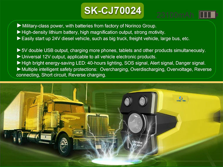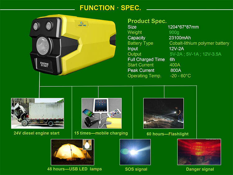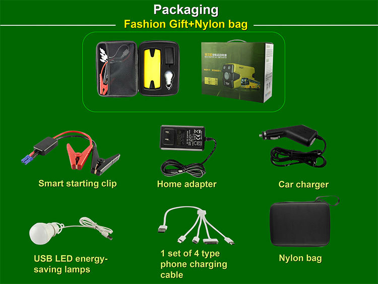 1.Charging for mobile phones and laptops, starting cars, adjustable LED lights (torch, strobe lights and SOS lights).