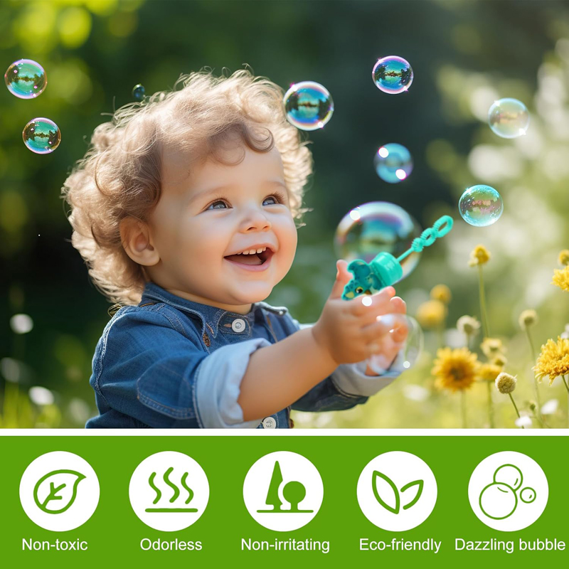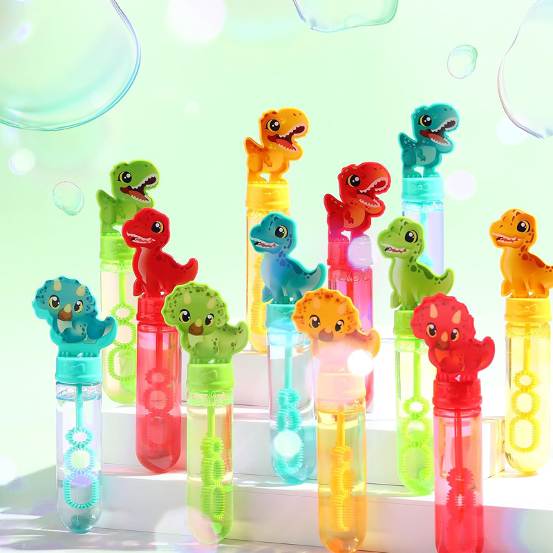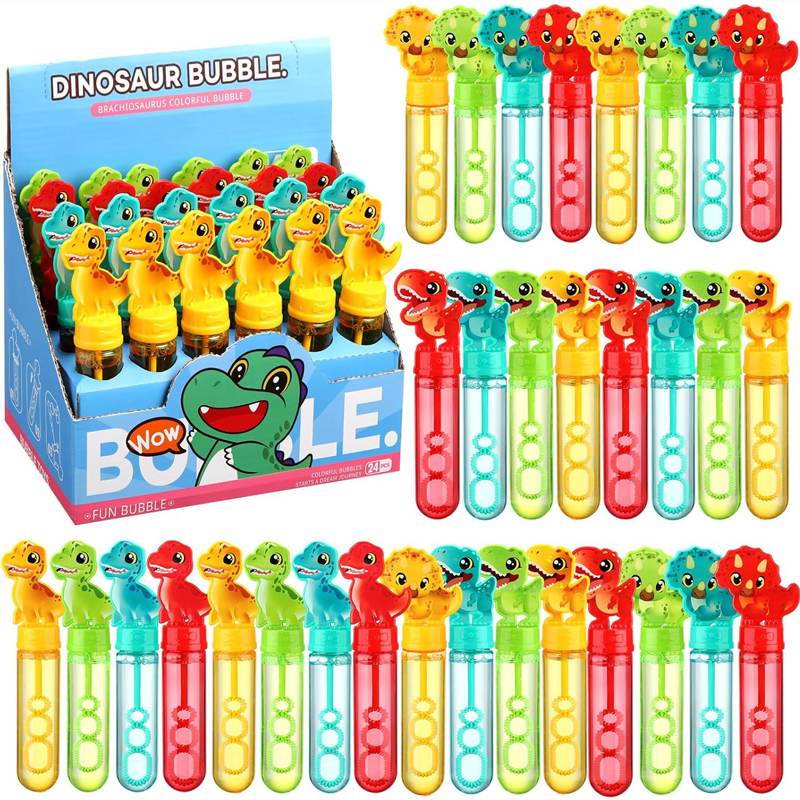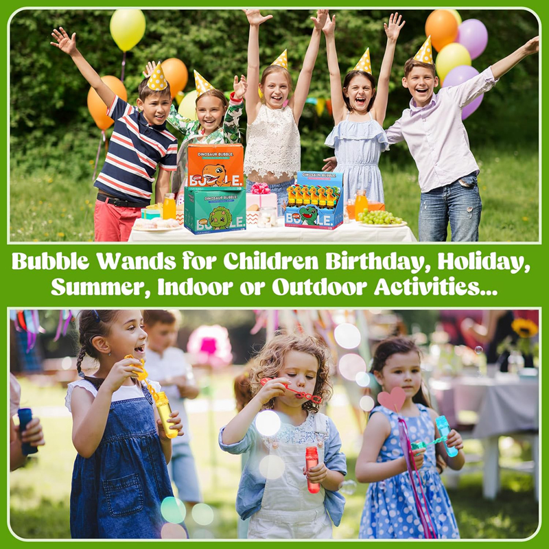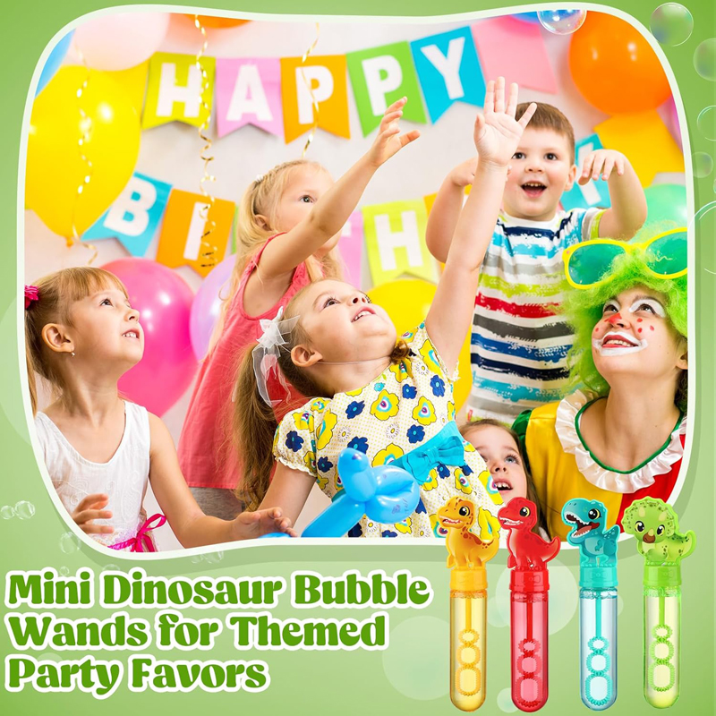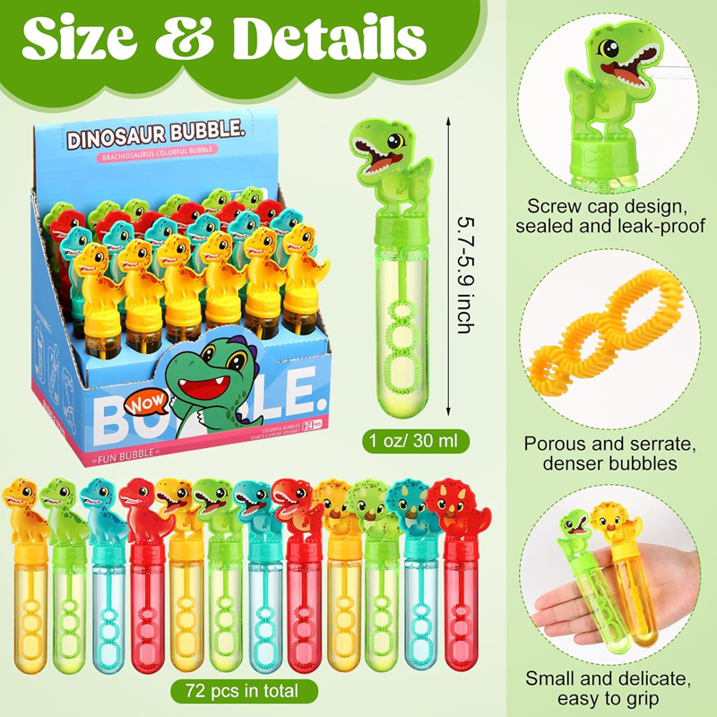 1.Dinosaur Themed Design: you will receive 72 cute dinosaur bubble wands, including 3 different dinosaur designs, each with 4 different colors ensuring that the fun never stops; These dinosaur styles not only increase children's interest in playing but also help to cultivate recognition for dinosaurs; Please rotate the lid with a threaded opening when using it, do not rotate the dinosaur's body 2.Pocket Bubble Toys: they are about 5.7-5.9 inches tall and the capacity is about 1 oz/ 30 ml, a comfortable size for kids to hold and carry; Our bubble blowing toys boast a sealing design with a rotating cover that ensures no leakage even when upside down; This smart design means less mess, more bubbles, and a worry free time 3.Quality and Safety: our bubble wands are crafted from durable, non toxic, and odorless ABS plastic; Each bubble wand is prefilled with a bubble solution made from soap concentrate with delicate bubbles that leave no marks; Avoid swallowing bubble solution and we recommended for children over 6 years 4.Versatile Bubble Makers: the 3 hole widened design makes the bubbles more dense; When you wave or gently blow air into bubble sticks, they will produce many bubbles of different sizes; These bubble wands are not just limited to kids' parties; They also make great gifts for school events, outdoor camping, weddings, prize boxes, and even gift bag stuffings; This versatility makes our bubbles party favors the ideal choice for any occasion 5.Party Favors: our dinosaur birthday party favors, dinosaur bubble wands, are a hit at any social gathering; They are good for themed birthday parties, Easter basket stuffing, classroom rewards, and holiday celebrations; Whether it's for Christmas, Halloween, or Thanksgiving, these bubble wands add a touch of fun