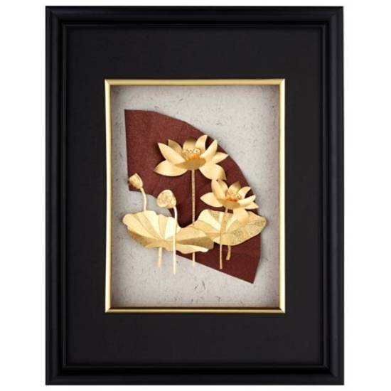 The exquisite lotus craft features brilliant 24K gold foil in a traditional Chinese art style. It comes with a sophisticated dark wooden frame in a harmonious design. It simply decorates your home in a luxurious way.