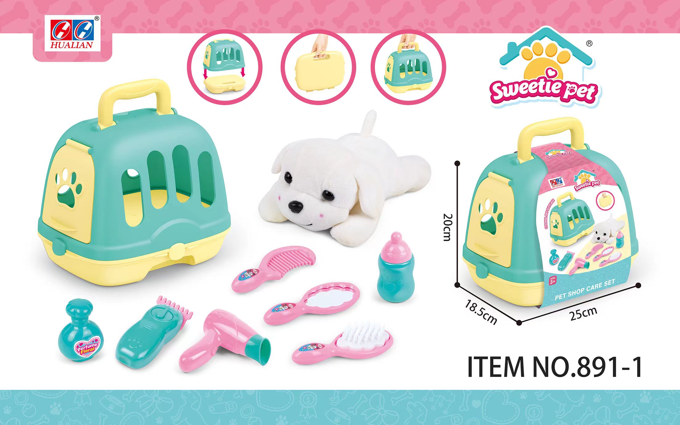 Very cute plush dog with 2in1 cage, hairdressing and feeding toy set in the bottom case,easy to carry,pet dog in cage,boys and girls can play with their friends!