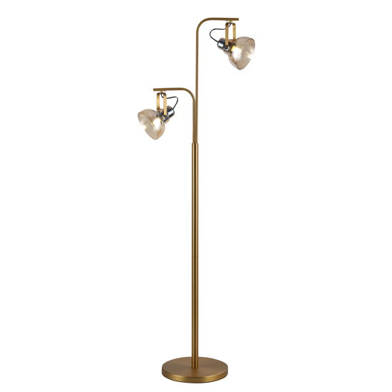 2Lt Floor Lamp, Material:Metal+Glass,Bulb:2x E27 Max.40W, Product Size:L440×W300×H1560mm, Shade size:Ø142×130mm Colour:Black + smoke glass , or Gold + Black metal parts / Cognac glass, or Black + Clear glass, Packing:white box+colour label