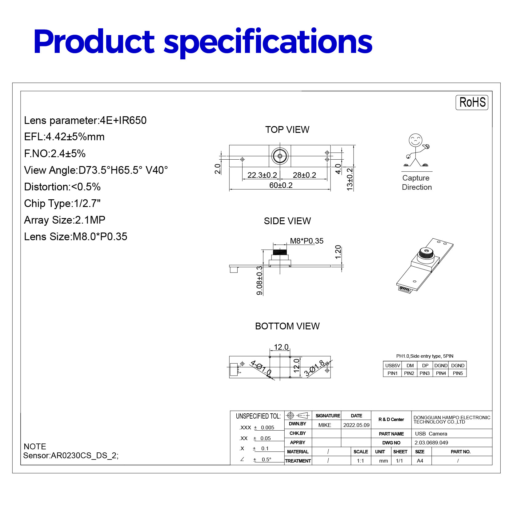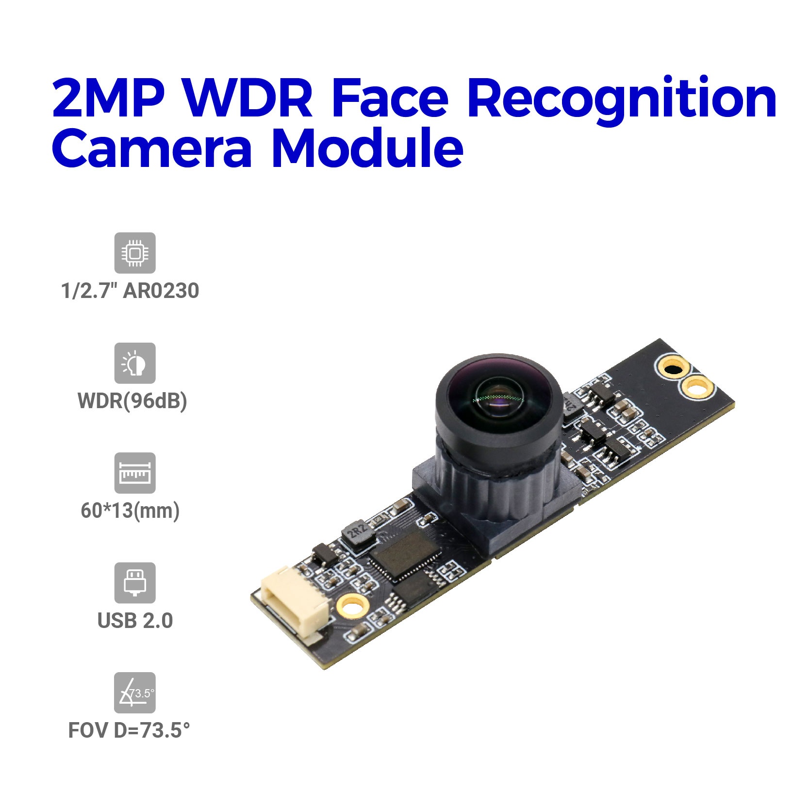 HAMPO-003-0689 is a 2MP HDR(High Dynamic Range) camera module with a wide view of angle no distortion lens,the dynamic range up to 96dB,which allow the camera could compensates for images where there are dark and bright areas with WDR technology,in which can see sharp image even under the backlight. This HDR USB camera moduless are compliant with UVC protocol, based on 1/2.7" AR0230 CMOS image sensor with pixel size of 3.0 x 3.0 µm and a dedicated high-performance Digital Signal Processor (DSP), that performs all the Auto functions (Auto White Balance, Auto Exposure control). This 2MP camera module captures sharp images at a 30fps high frame rate per second.
