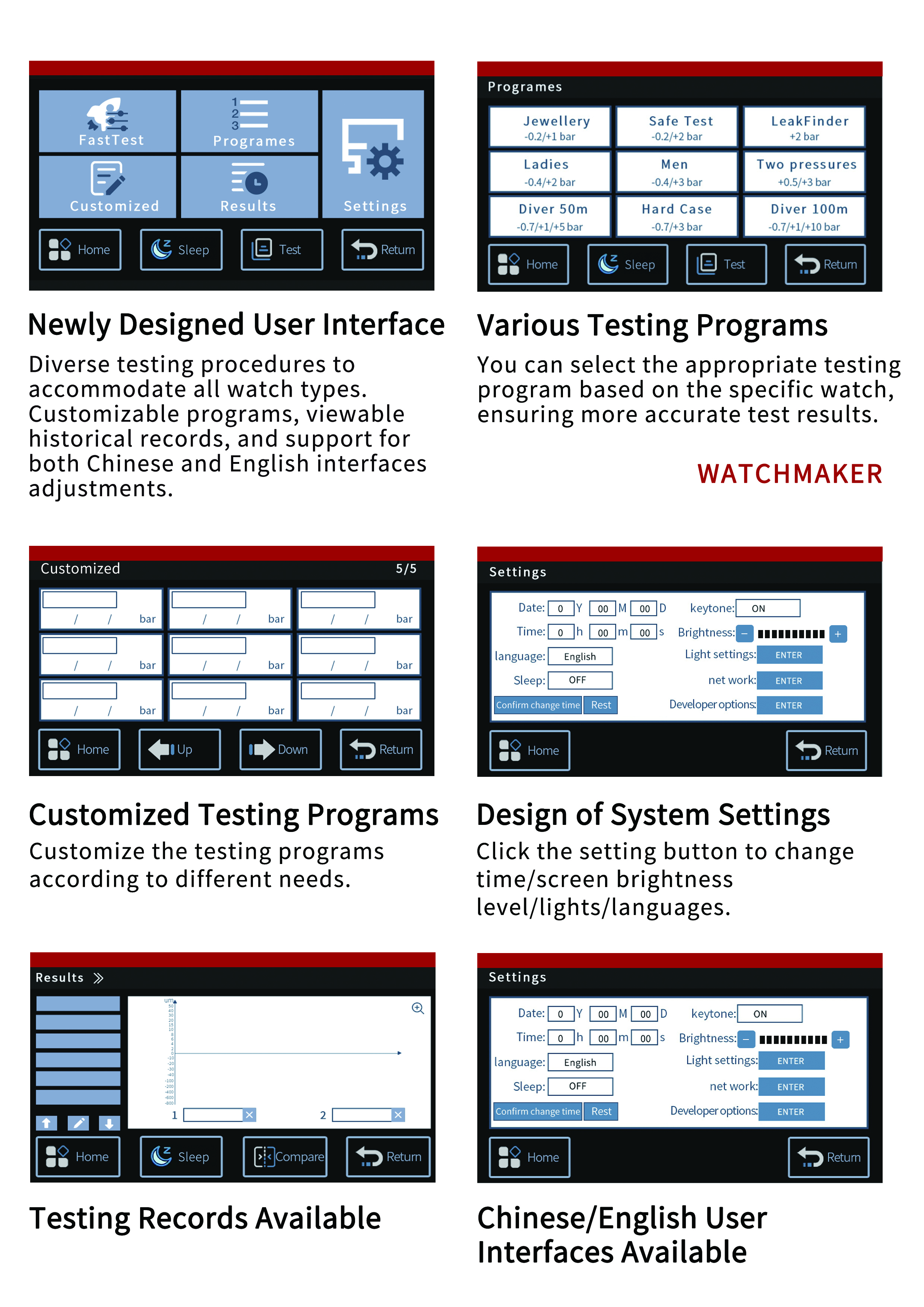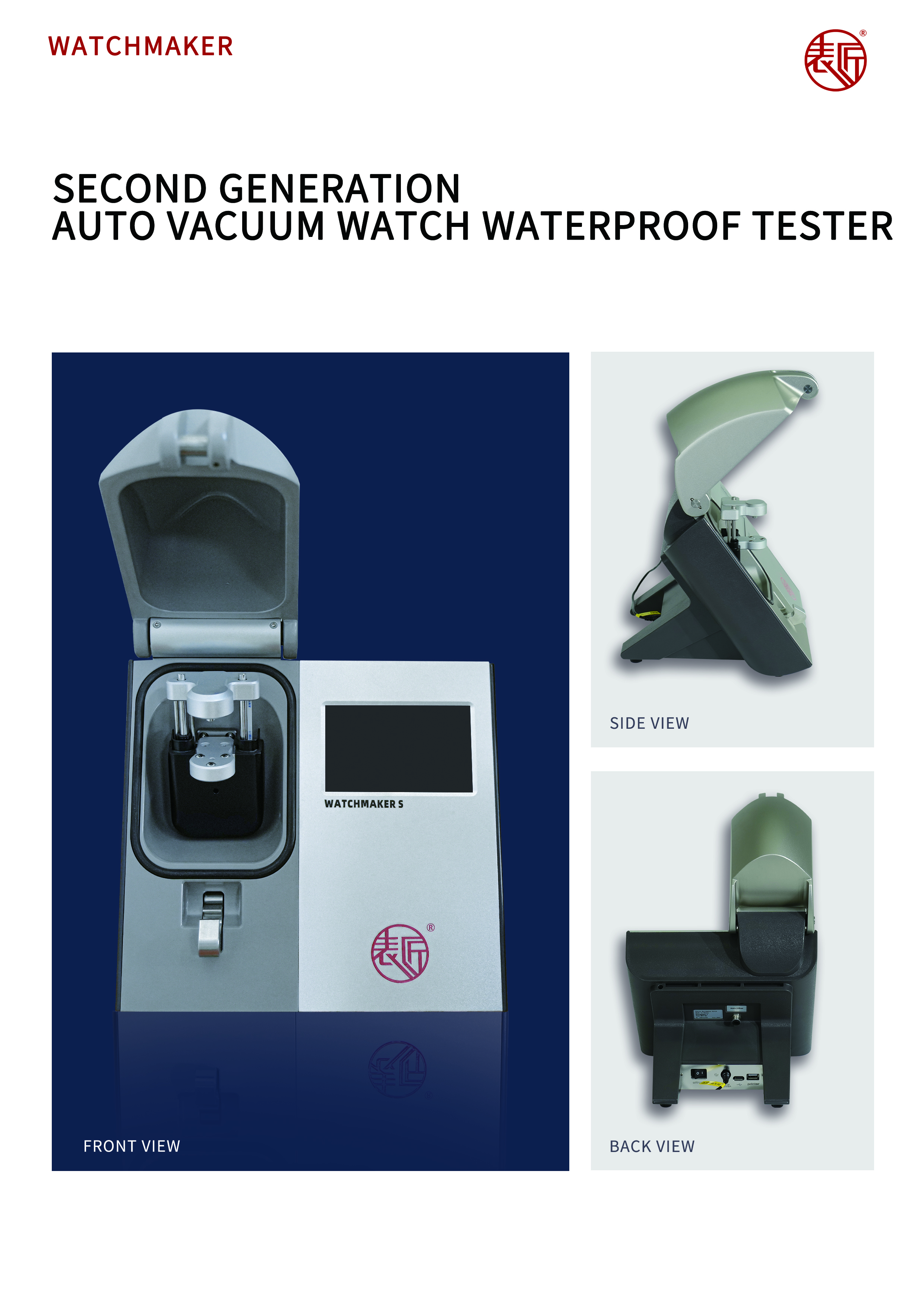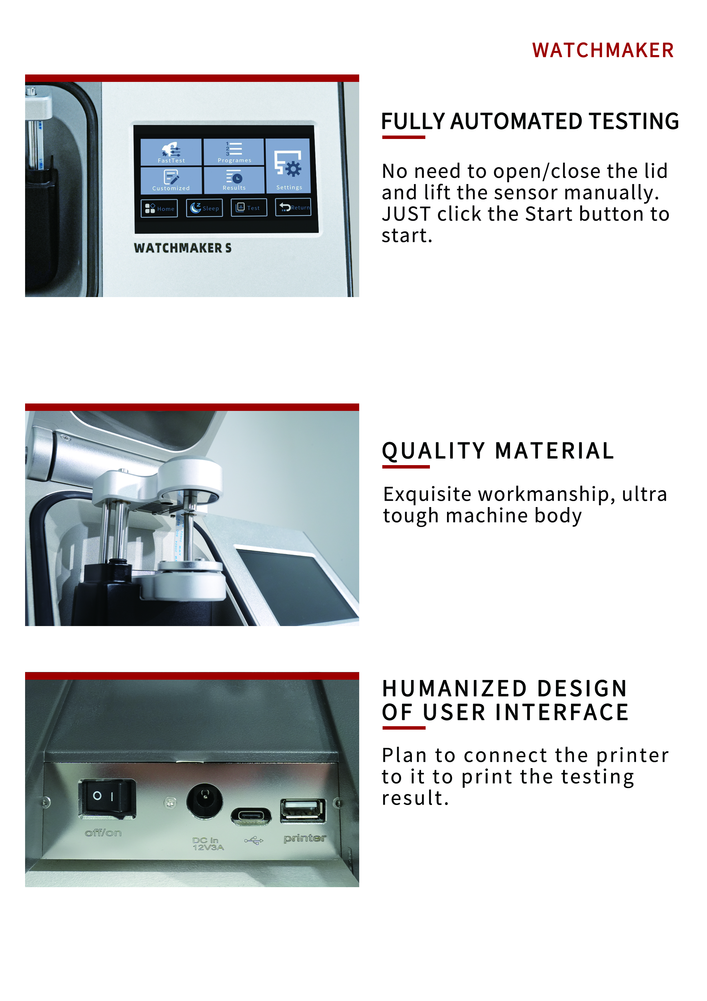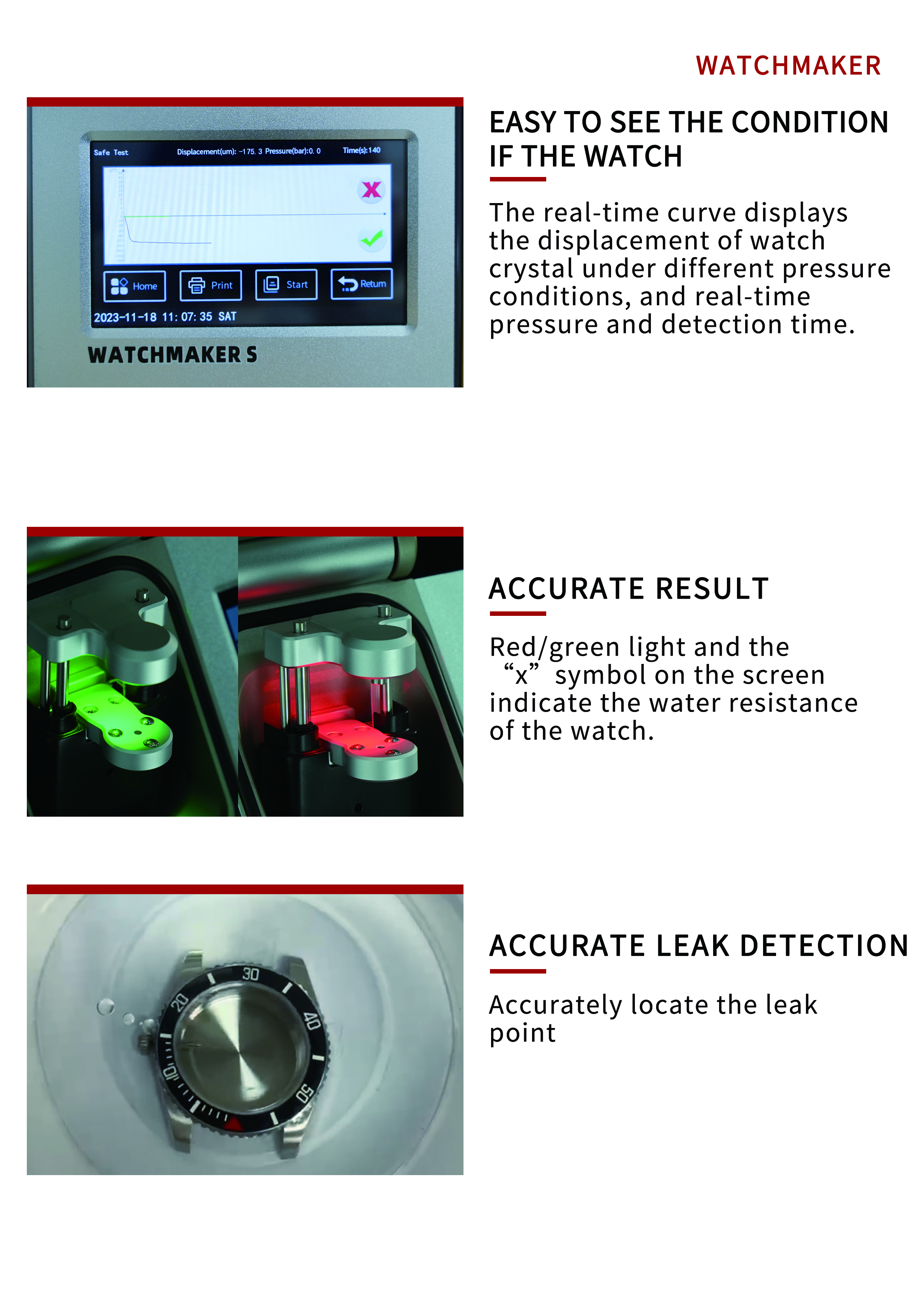 Fully automatic measurement, with multiple test programs, capable of detecting watch leaks through leak testing, requires an air compressor, equipped with a built-in printing system