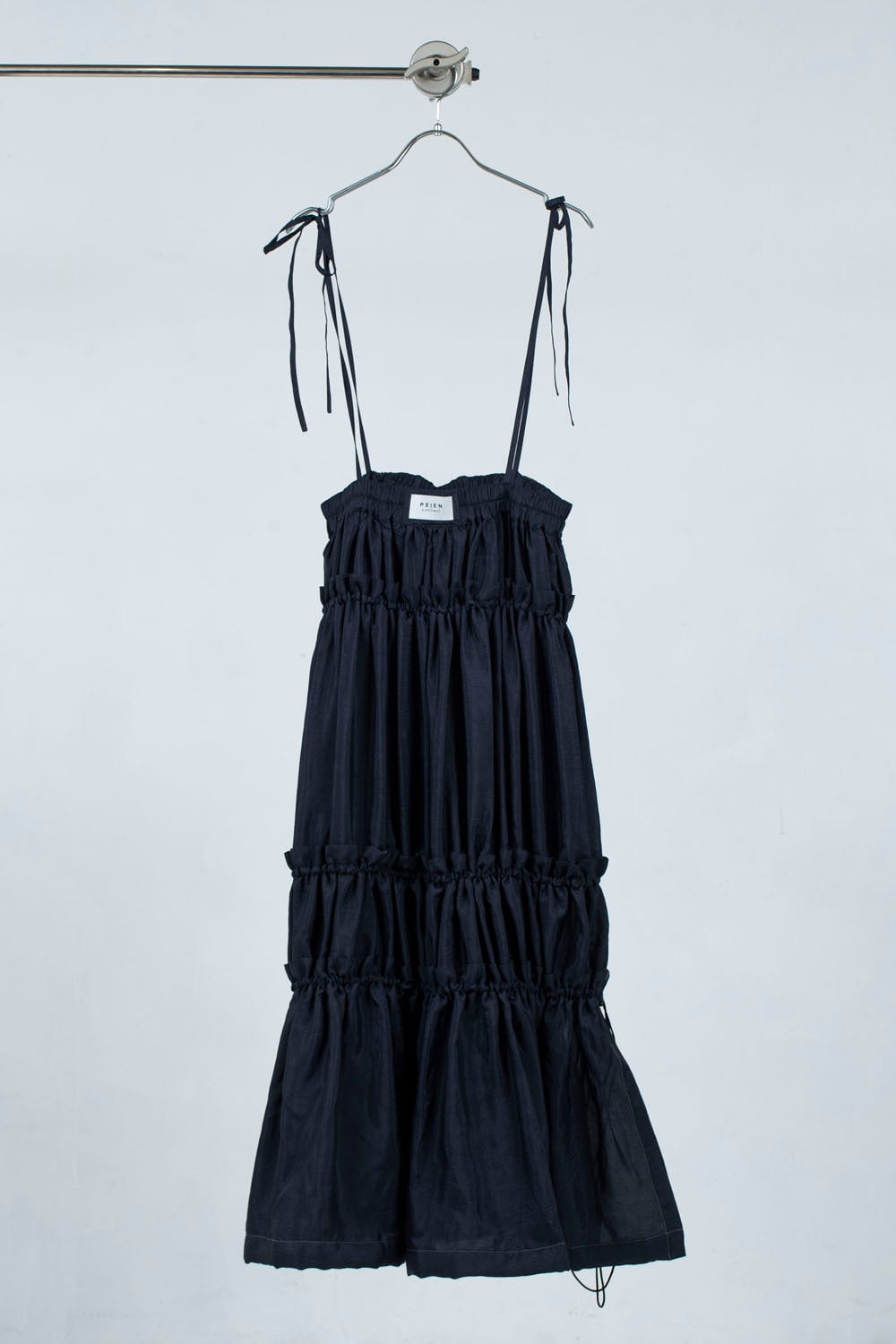 2-way dress with plenty of gathers.It features a shiny textile, and the gathers can be tightened to change the silhouette and volume.