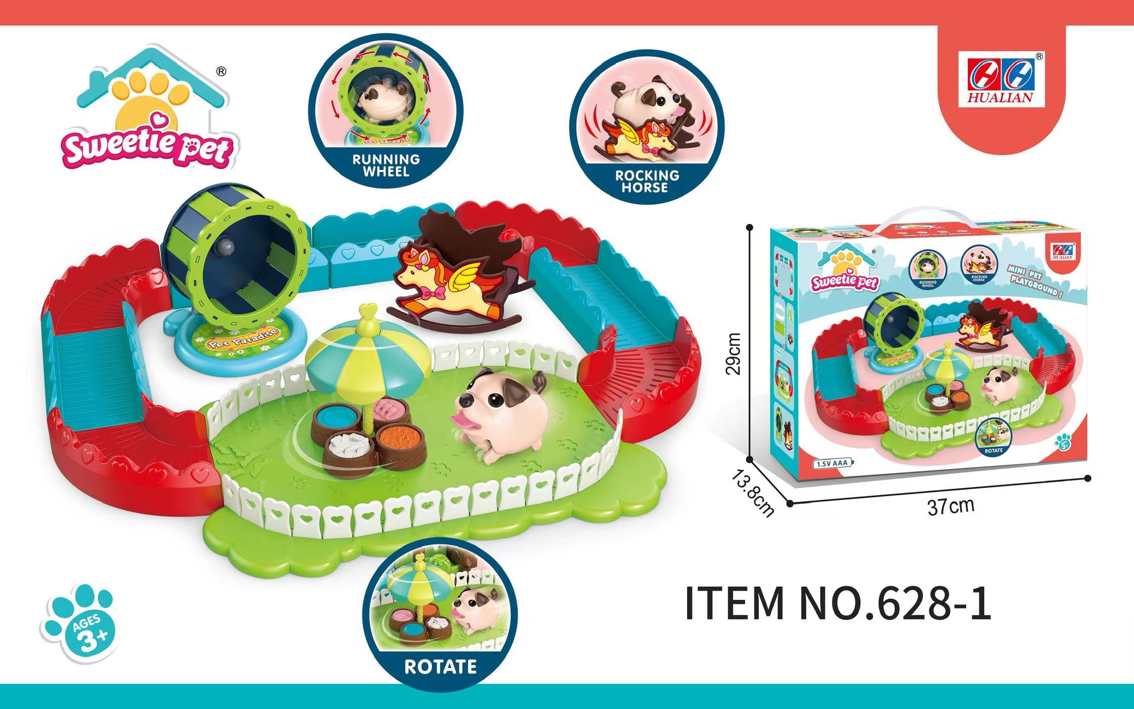 B/O min dog can play in its amusement park,swinging in track, running wheel,rocking horse,very happy time!