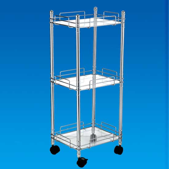This 3-layer storage unit is designed with four casters for mobility in usage. This metallic rack presents with a modern, simplistic style. The vertical rods of the unit can be used as handles for pushing or pulling.
