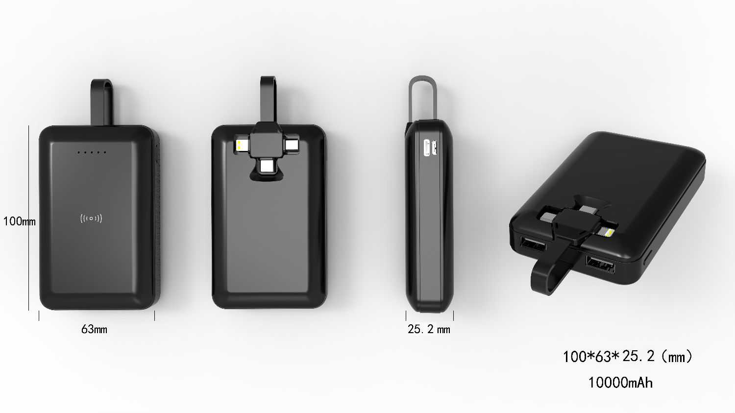 Material: ABS Product size:100*63*25.2mm Battery type:955465 Li-polymer 5000mAh*2=10000mAh TypeC&Micro input:5V/2A USB A output1/2: 5V/2A Built-in cable(lightning/Type C/Micro ): 5V/2A Wireless output:5W