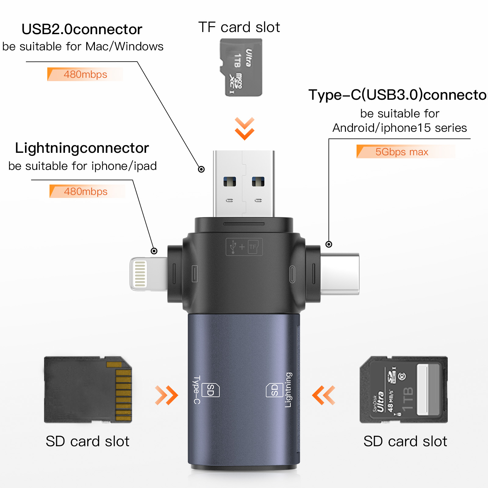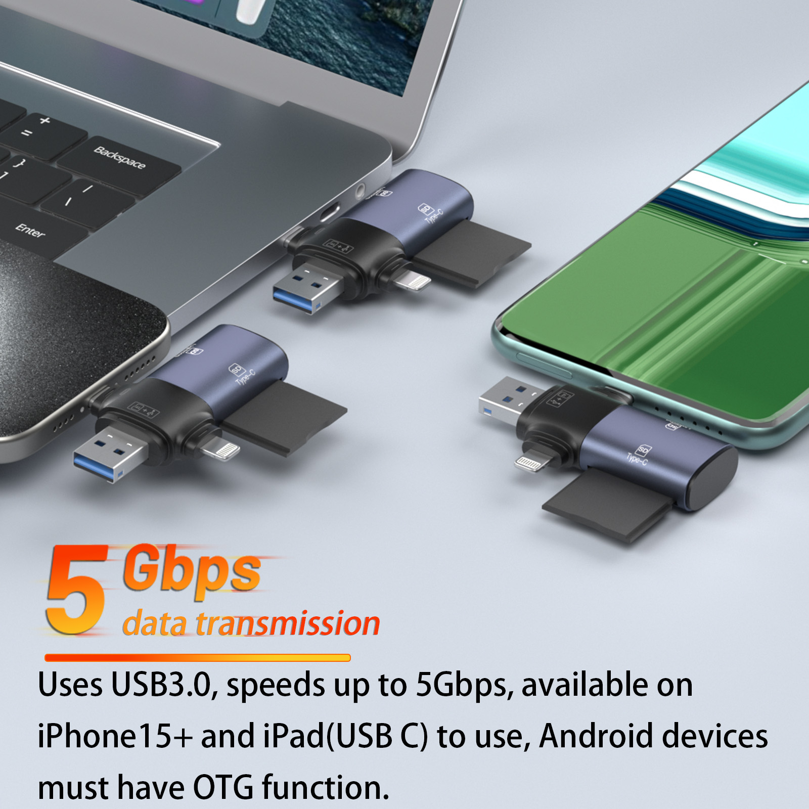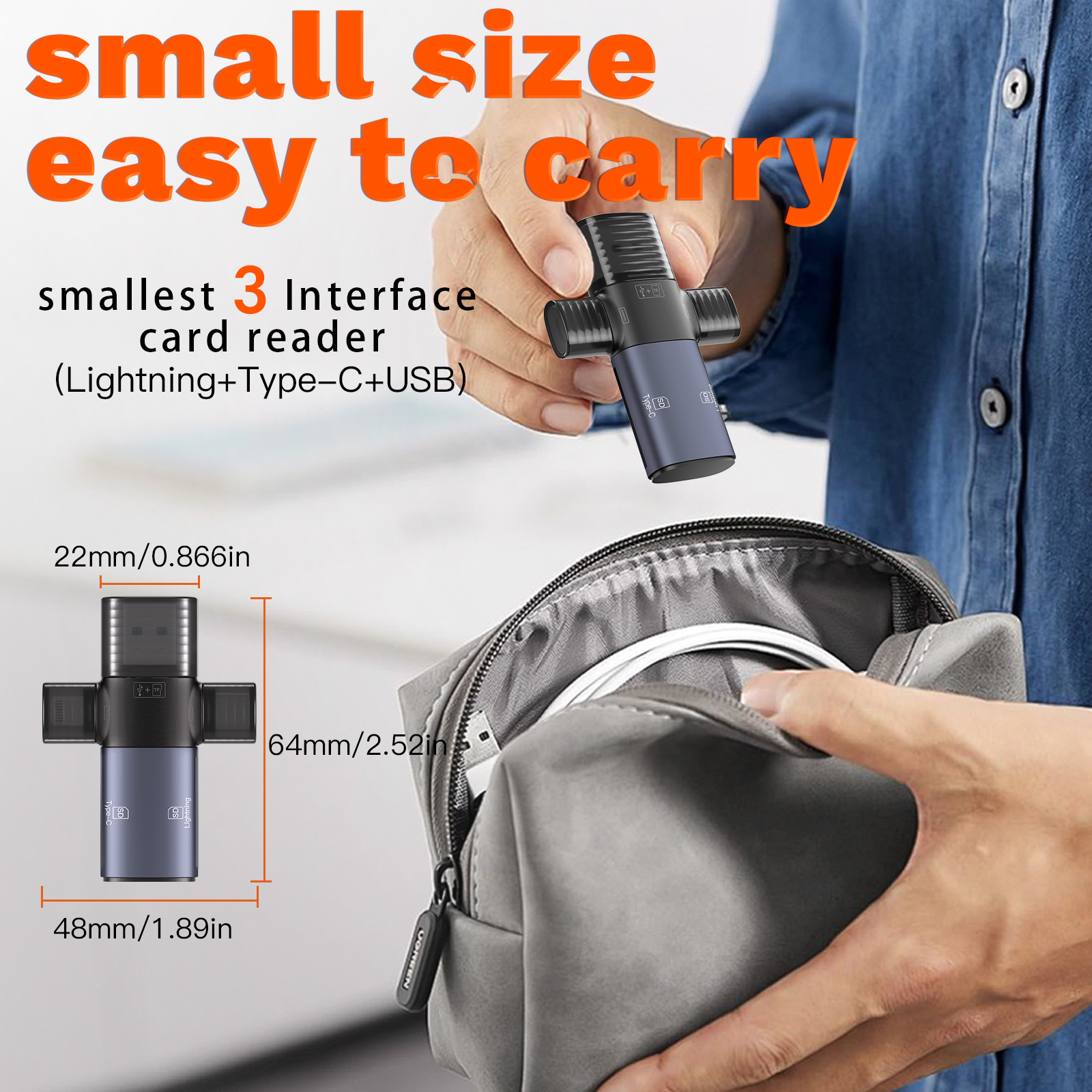 As a professional digital accessories provider, ZOIOT presents this 3-in-1 USB 3.0 SD/TF card reader, designed for seamless cross-device data management. Featuring Lightning, USB-A 3.0, and USB-C 3.0 interfaces, plus dual SD card slots and a hidden TF card slot, it supports plug-and-play across iOS, Android, Windows, and Mac systems. Delivering high-speed transmission (USB 3.0 up to 5Gbps, Lightning/USB 2.0 up to 480Mbps), it efficiently transfers large files and reads camera memory cards. Its compact, portable design (64mm×48mm×22mm) and hidden TF slot prevent card loss, making it ideal for travel and daily use. Perfect for photographers and professionals, it simplifies data sharing and storage expansion across all devices.