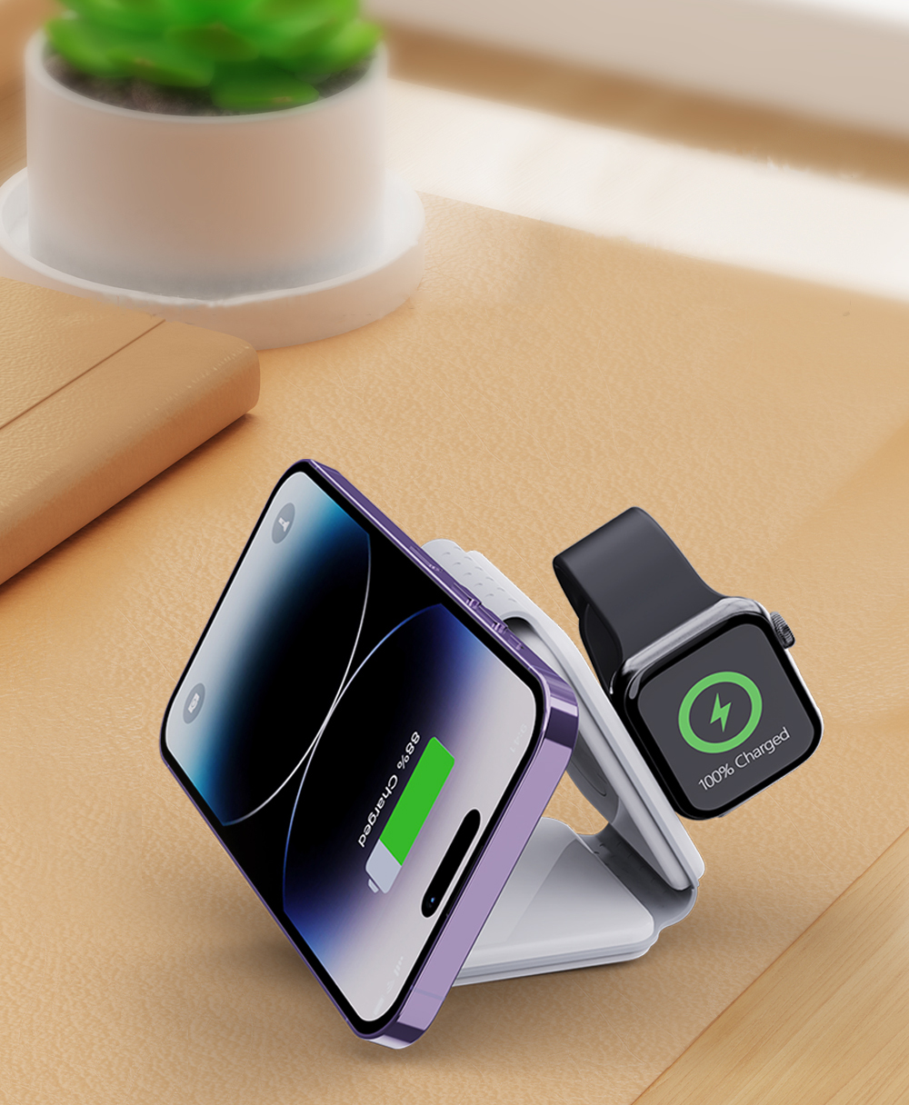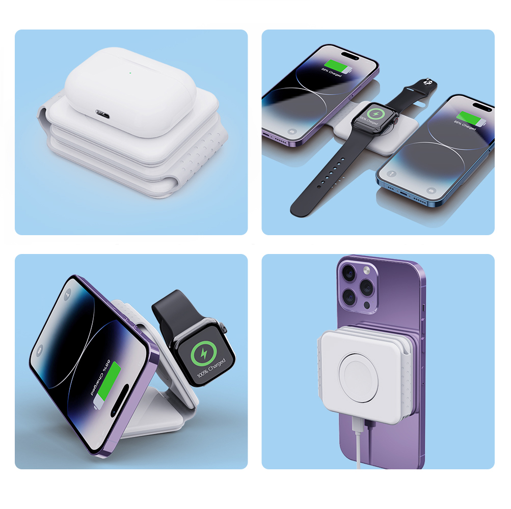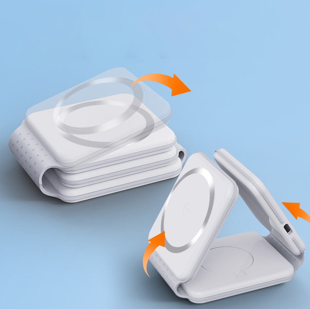 | Foldable Magnetic 3 in 1 fast 15W wireless charger. Just simply place your phone (Apple or Android), Apple Watch and Earbuds on Power Stand, there's no need to connect it with a cable anymore. 9V/2A 12V/2A Output Power:5W/7.5W/10W/15W. Output of earphone wireless charging: 5W Max Watch wireless charging output: 2.5W Max. Complies with CE, FCC, RoHS. |