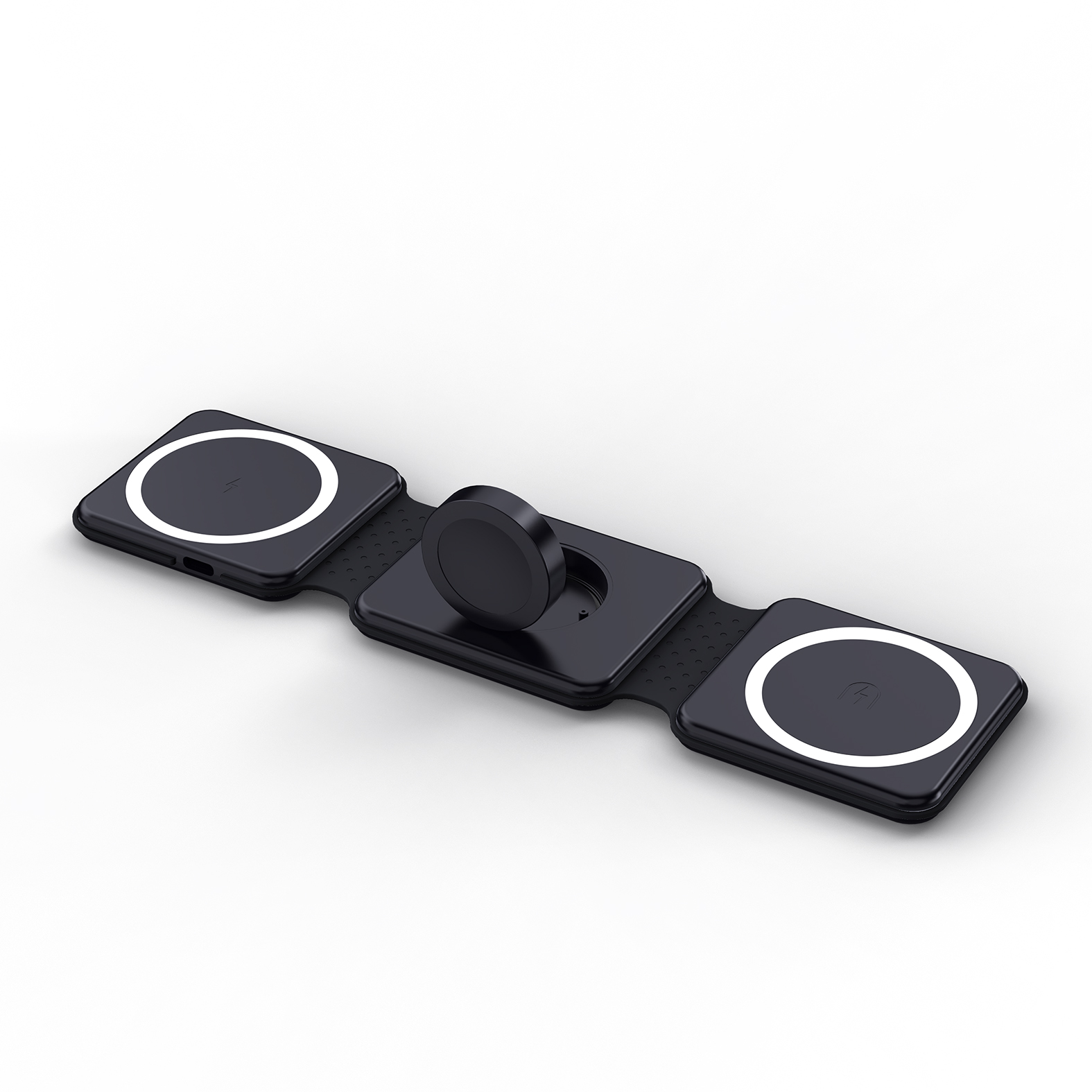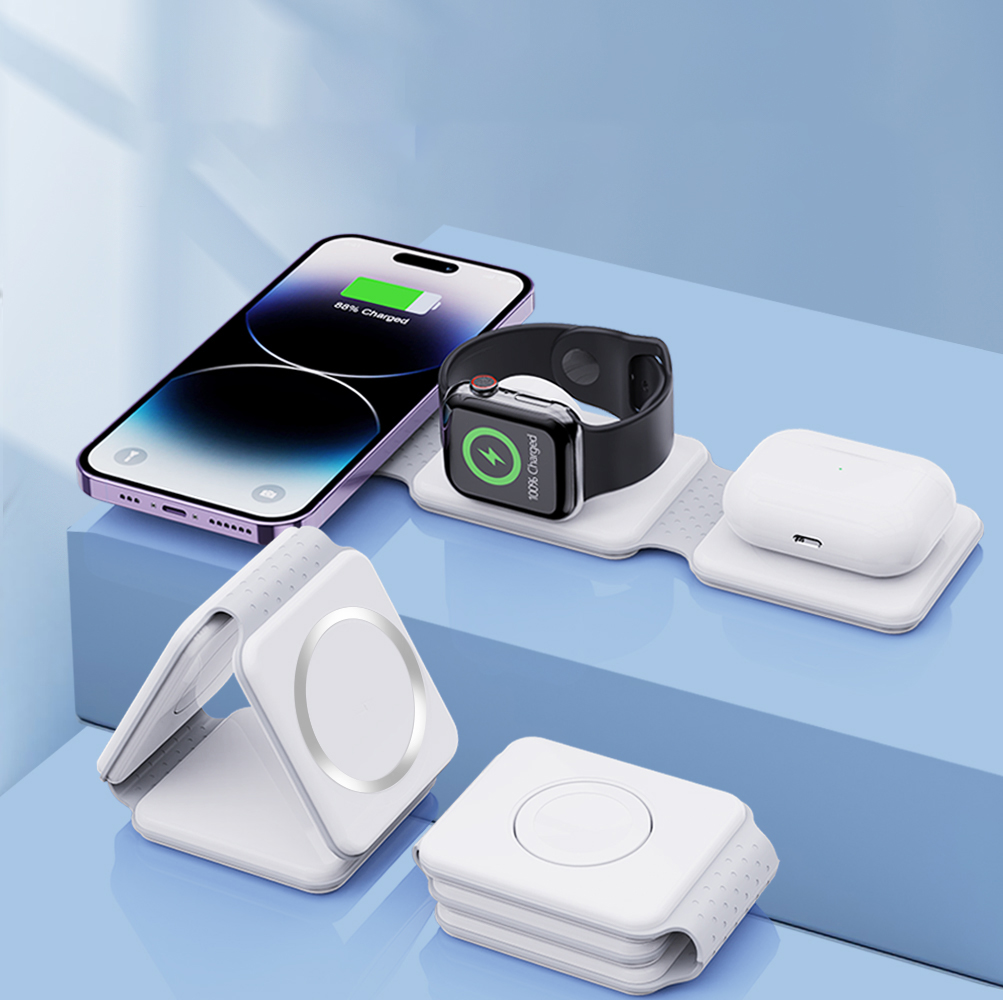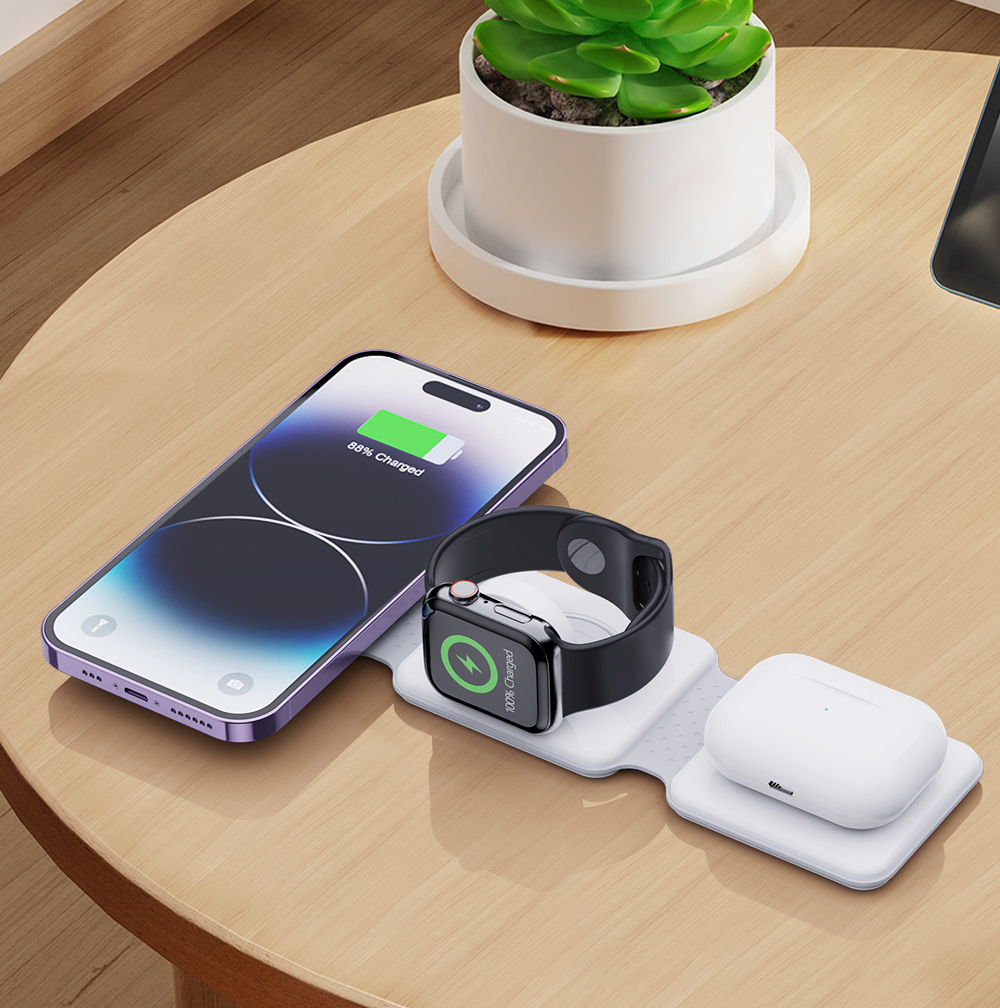 | Foldable Magnetic 3 in 1 fast 15W wireless charger. Just simply place your phone (Apple or Android), Apple Watch and Earbuds on Power Stand, there's no need to connect it with a cable anymore. 9V/2A 12V/2A Output Power:5W/7.5W/10W/15W. Output of earphone wireless charging: 5W Max Watch wireless charging output: 2.5W Max. Complies with CE, FCC, RoHS. |