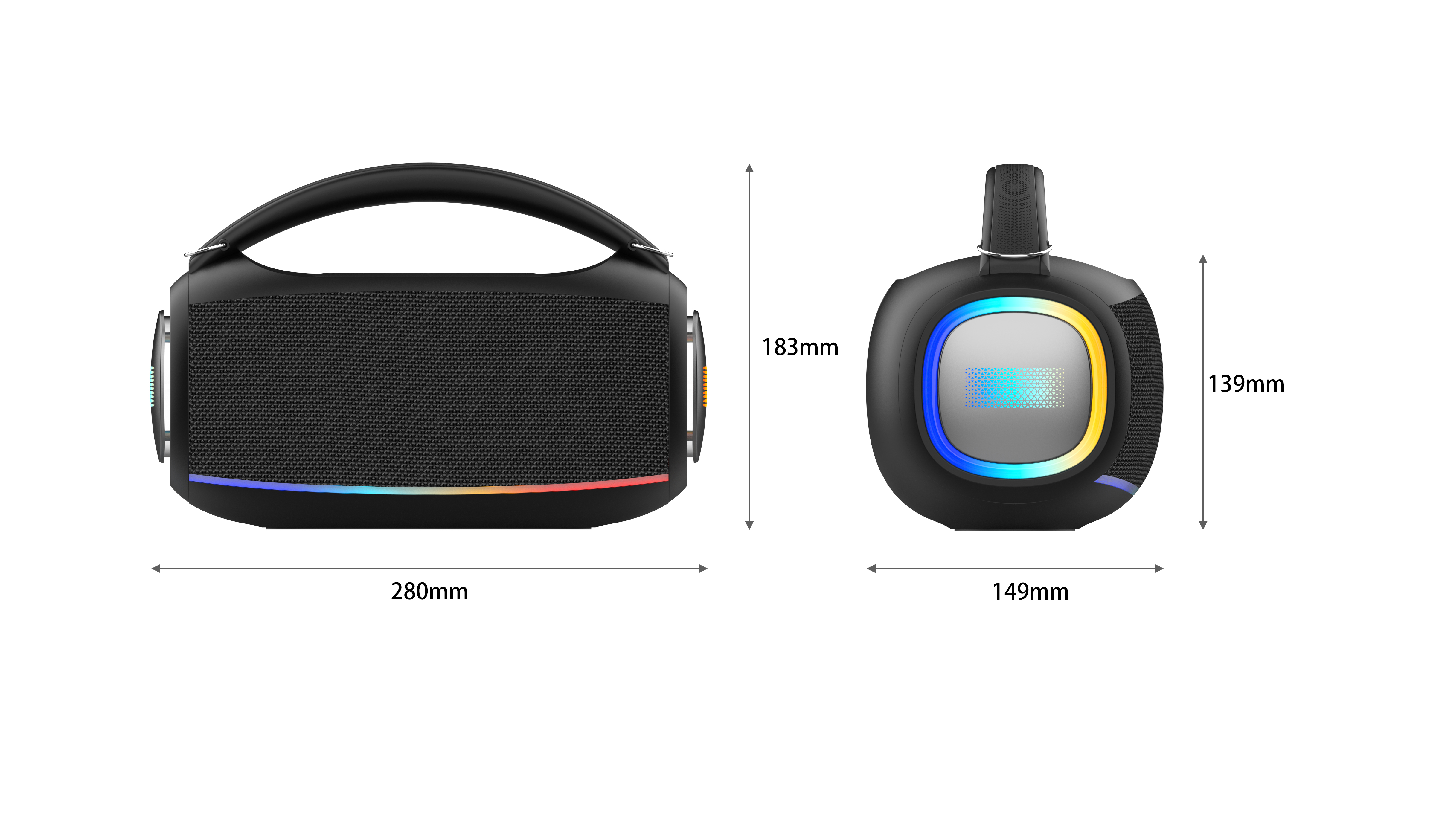 | Selling point | 1.Powerful bass with clear sound 2.With belt,easy to carry 3.OEM laser caving logo 4.OEM different colors 5.RGB lights |
