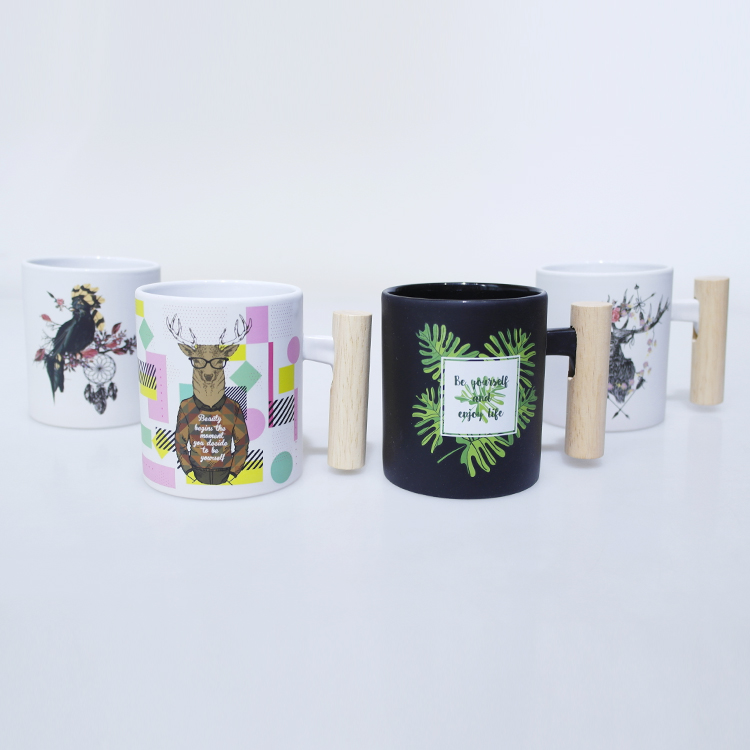 330ml White /Black Ceramic Coffee Milk Tea Mug With Wood Handle And Deer Printing Design