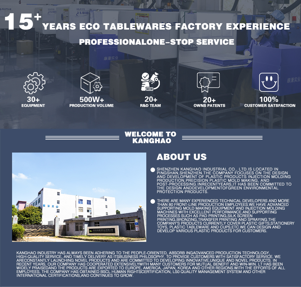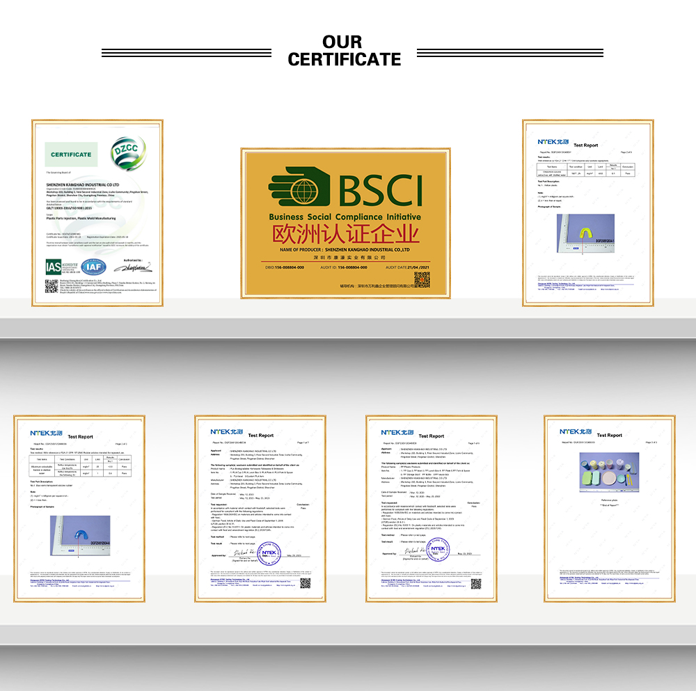 Shenzhen Kanghao Industrial Co., Ltd is a 13-year-old industrial and trade integrated enterprise integrating R&D and production. Since its establishment, the company has been committed to the development, design and production of environmentally friendly green products. Always adhere to the corporate tenet of "integrity, innovation and communication”. Based on technology, service and quality, taking green and sustainable development as the direction, and form a complete set of design, research and development, production, packaging, one-stop service system. Equipped with injection molding machines, spark machines, computer gongs, grinders, drilling machines, milling machines and other equipment. The factory has injection molding workshops, mold manufacturing workshops, and printing and packaging workshops. After years of hard work, the company has established stable partnerships with many domestic and foreign companies, and the company has gradually formed strong talents, technology, quality, and service advantages. And has successively become the close partner of: IMPARK, SEIBU, POWGHT, Zhongxi Electronics, NAUTILUS, LUCAS etc. With the unremitting efforts and persistence of all my colleagues in the company, the ISO quality system has been audited for many years in a row. And the company has been actively fulfilling its social responsibilities under the BSCI framework.