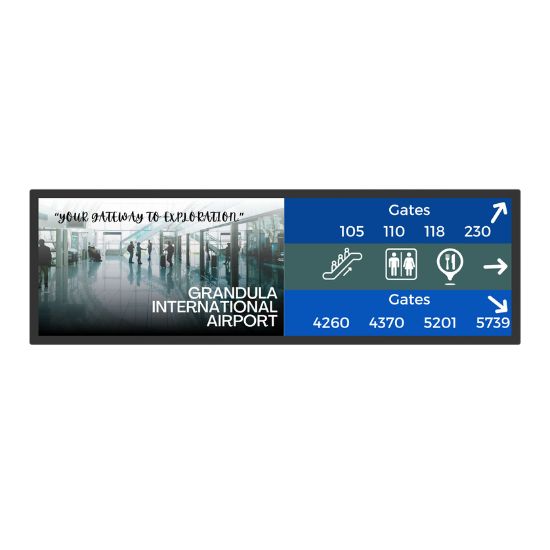 The Capella Stretched Display is a cutting-edge solution designed for dynamic visual presentations, featuring a generous 37-inch screen with an impressive resolution of 1920 x 540. With a brightness of 700 cd/m² and a contrast ratio of 1000:1, this display ensures vibrant and clear images, making it ideal for high-traffic environments such as retail spaces, transportation hubs, and corporate settings. Its ultra-wide 32:9 aspect ratio and active display area of 899.712 x 253.044 mm provide a panoramic viewing experience, perfect for showcasing advertisements, information, or multimedia content. The display supports 16.7 million colors and boasts a quick response time of 14ms, enhancing the overall visual experience.
