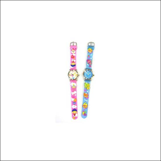 The children's watch on the left showcases light pink watch straps, adorning with embossed cartoon motifs on the surfaces. Shiny alloy watch case harmonizes with chromatic dial to flaunt a touch of splendor. Its analogue style enables children to read time more easily.