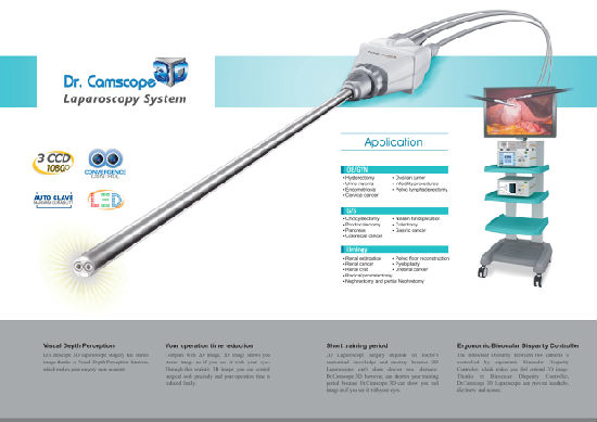 2D Laparoscope surgery depends on doctor's anatomical knowledge and mastery because 2D Laparoscope can't show doctor real distance. Dr. Camscope 3D, however, can shorten your training period because Dr. Camscope 3D can show you real image as if you see it with your eyes.