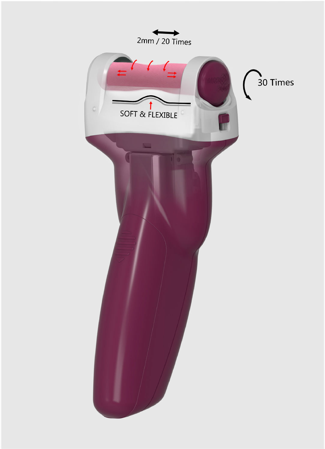 The revolutionary patented flex roller, made with microscopic mineral particles, flexes with the skin and pulverizes dead skin in seconds