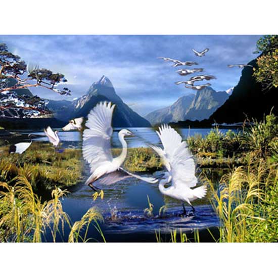 This vivid 3D picture spotlights two elegant white cranes frolicking in a pool. The 3D picture is crafted with brilliant colors and refined details. Update your home decor with this stunning 3D picture.