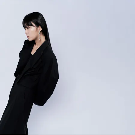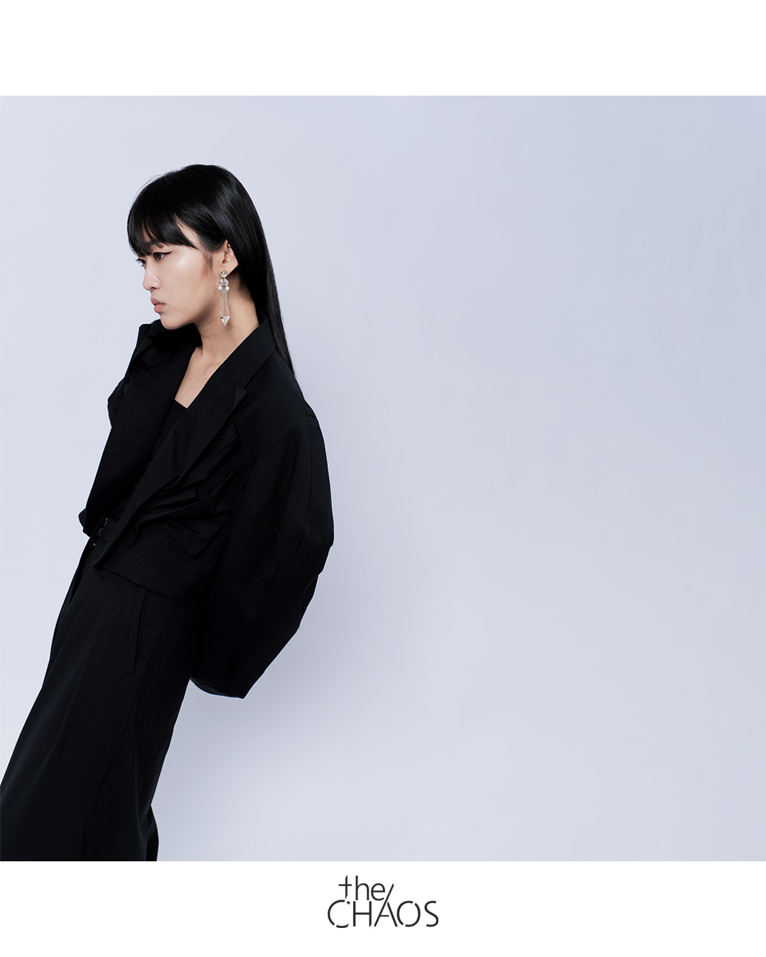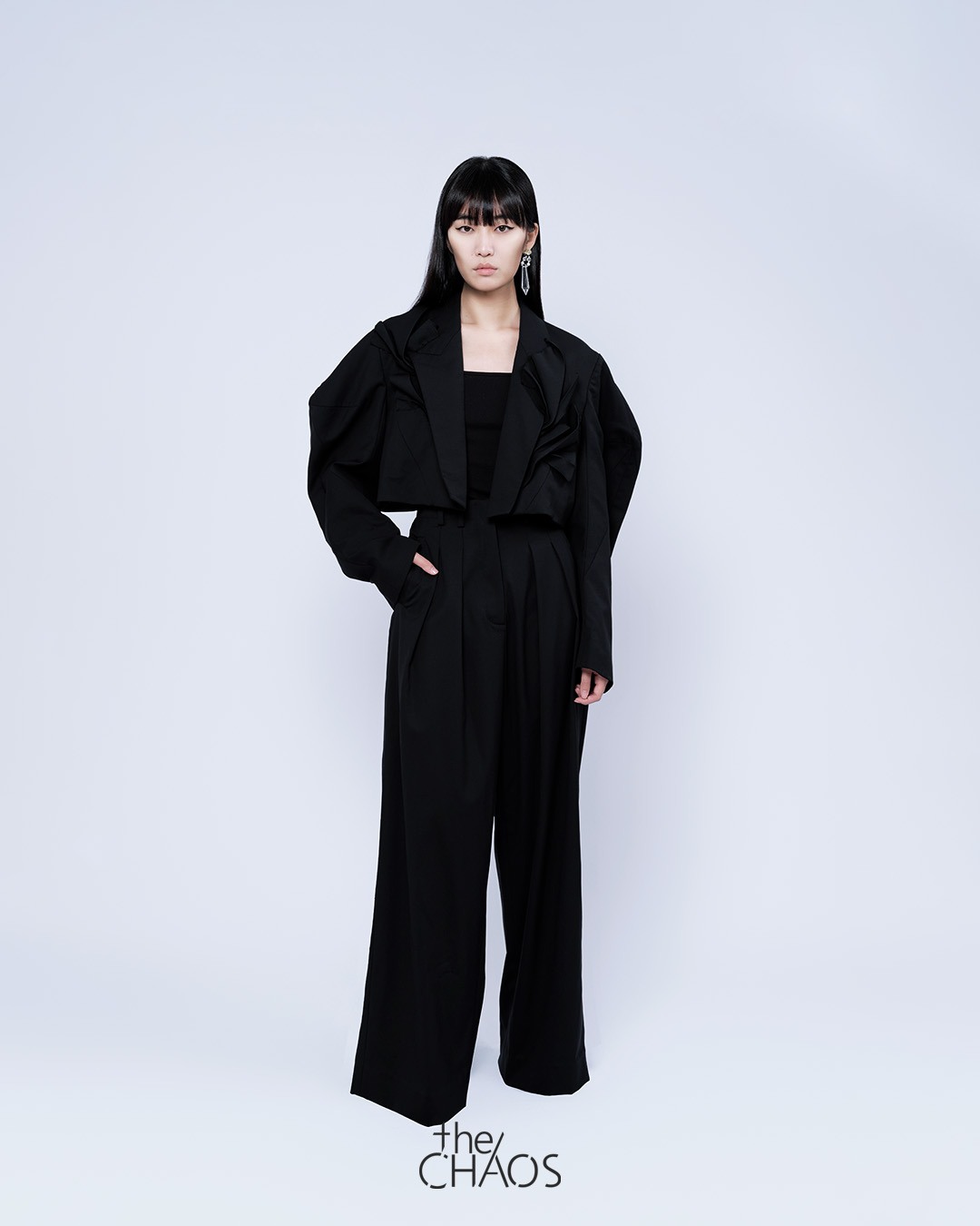 Iconic angle sleeves crop jacket with ‘Time Pause ‘ inspired 3D flow sculptures in deadstock tailoring fabric, Styling with a wide leg tailored pants in black.