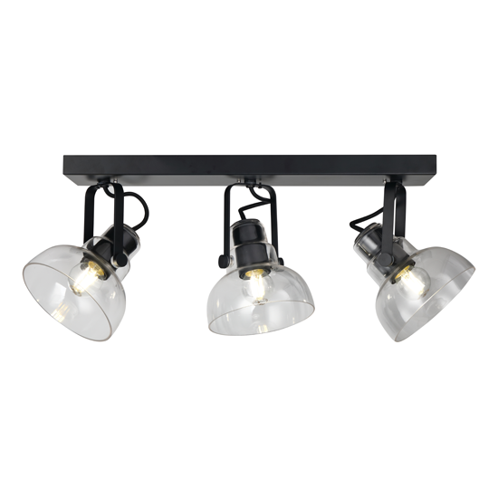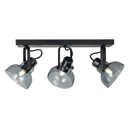3Lt Spot Light Bar, Material:Metal+Glass,Bulb:3x E27 Max.40W, Product Size:L522×W142×H210mm,Shade size:Ø142×130mm, Colour:Black + smoke glass , or Gold + Black metal parts / Cognac glass, or Black + Clear glass,Packing:white box+colour label