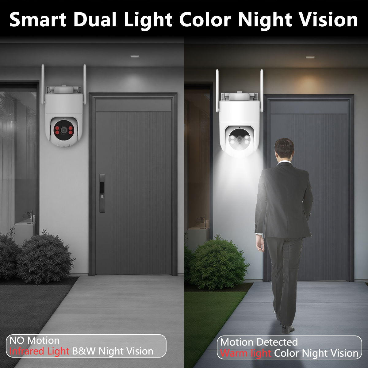 Experience superior 24/7 monitoring with the advanced dual-light night vision system, combining infrared and white LEDs to provide clear images in total darkness, with an illumination range of up to 20 meters. The 355° horizontal and 90° vertical PTZ rotation, along with 6 preset positions, offers unparalleled coverage of your property.
