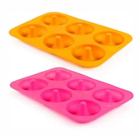 Specifications: 3 silicone donut molds (rose/purple/orange) . A total of 6 cavities, single cavity diameter is 7cm/2.75in, depth is 2.5cm/1in.