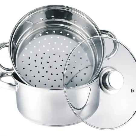 3pcs stainless steel steamer set, 0.6mm body thickness, 2.0mm aluminum capsule bottom, 430 induction protector, s/s hollow handle and knob, C style clear glass lid