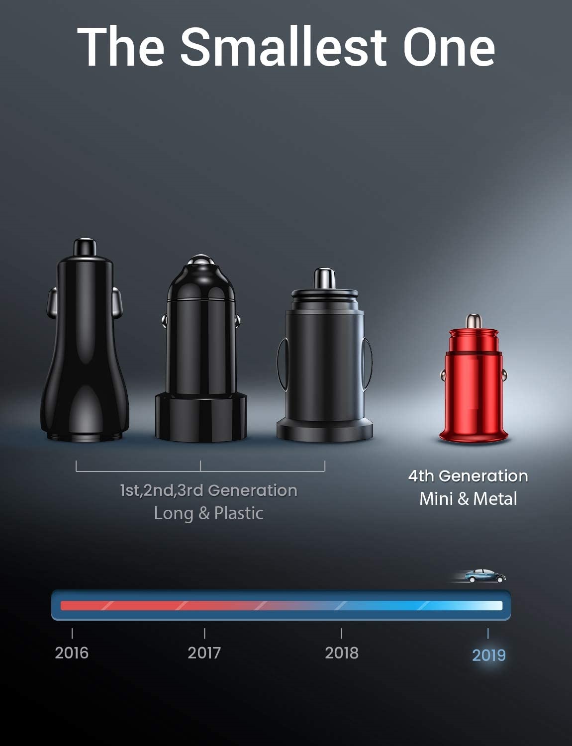 COMPACT SIZE: With tiny thumb-sized(Size: 1.7inch*0.9inch) body, it perfectly blends with most car cigarette lighter and sits comfortably with the edge of the outlet. Our smallest car charger yet; it´s portable and you can take everywhere.