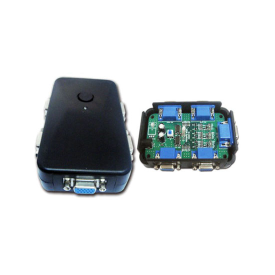 This is a four-way VGA splitter that boasts a robust housing for an extra-long service life. Users can easily broadcast the content from one single VGA output to multiple displays. The device is both safe and easy to operate.