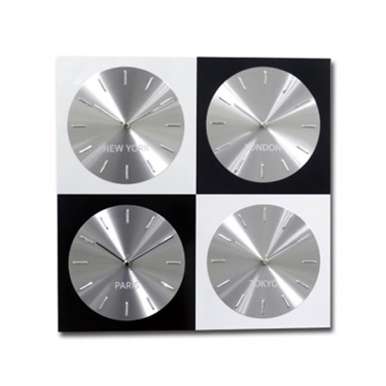 This time zone wall clock lets you know the updated time in different parts of the world. It consists of a total of 4 clocks that represent New York, Paris, London and Tokyo respectively. The metal clock faces on the black and white background is extraordinarily chic.
