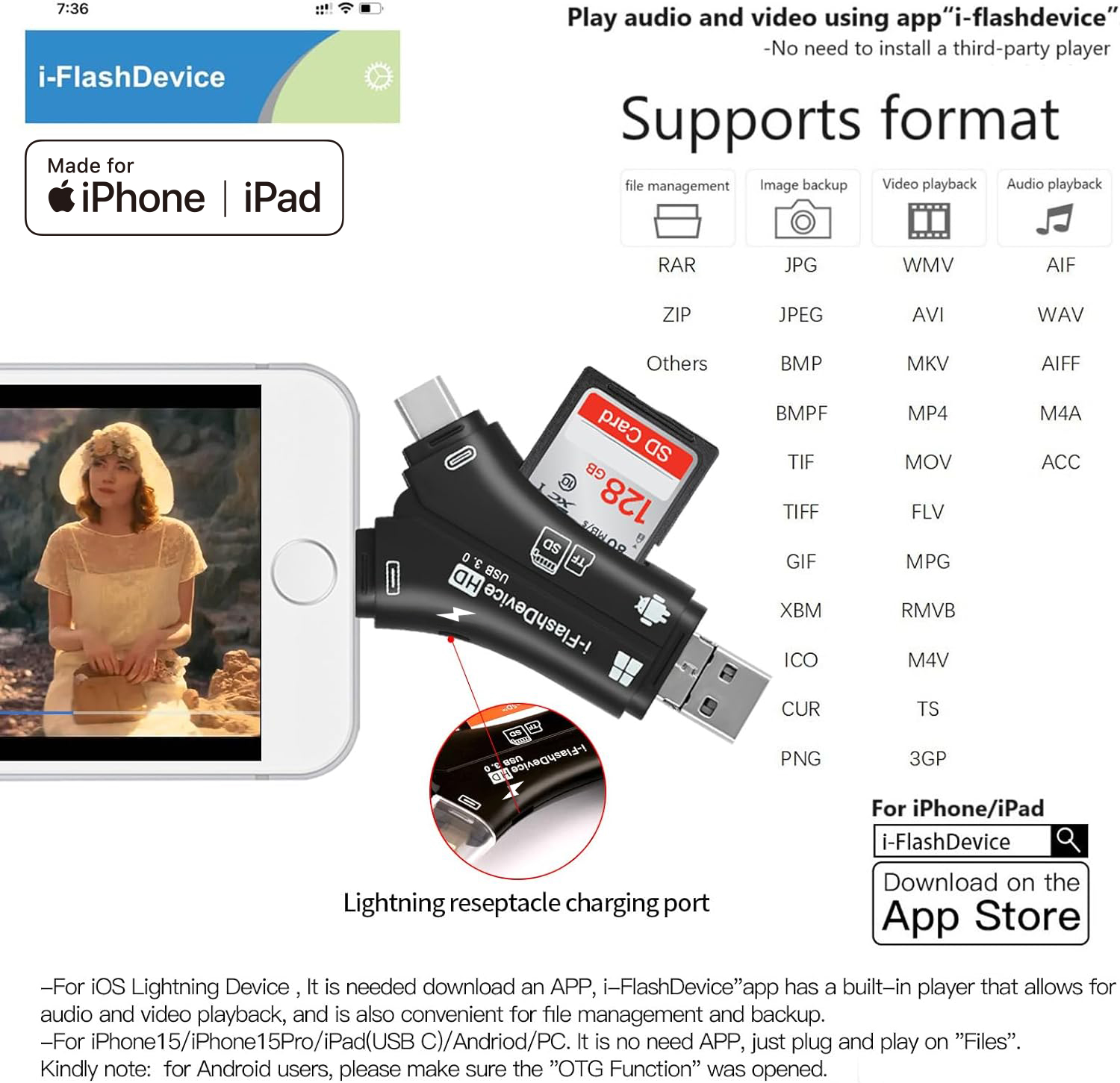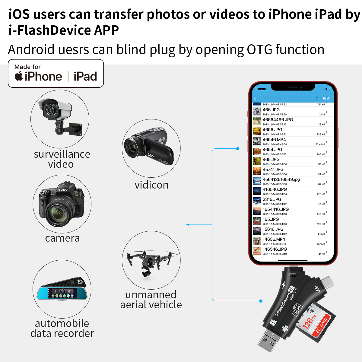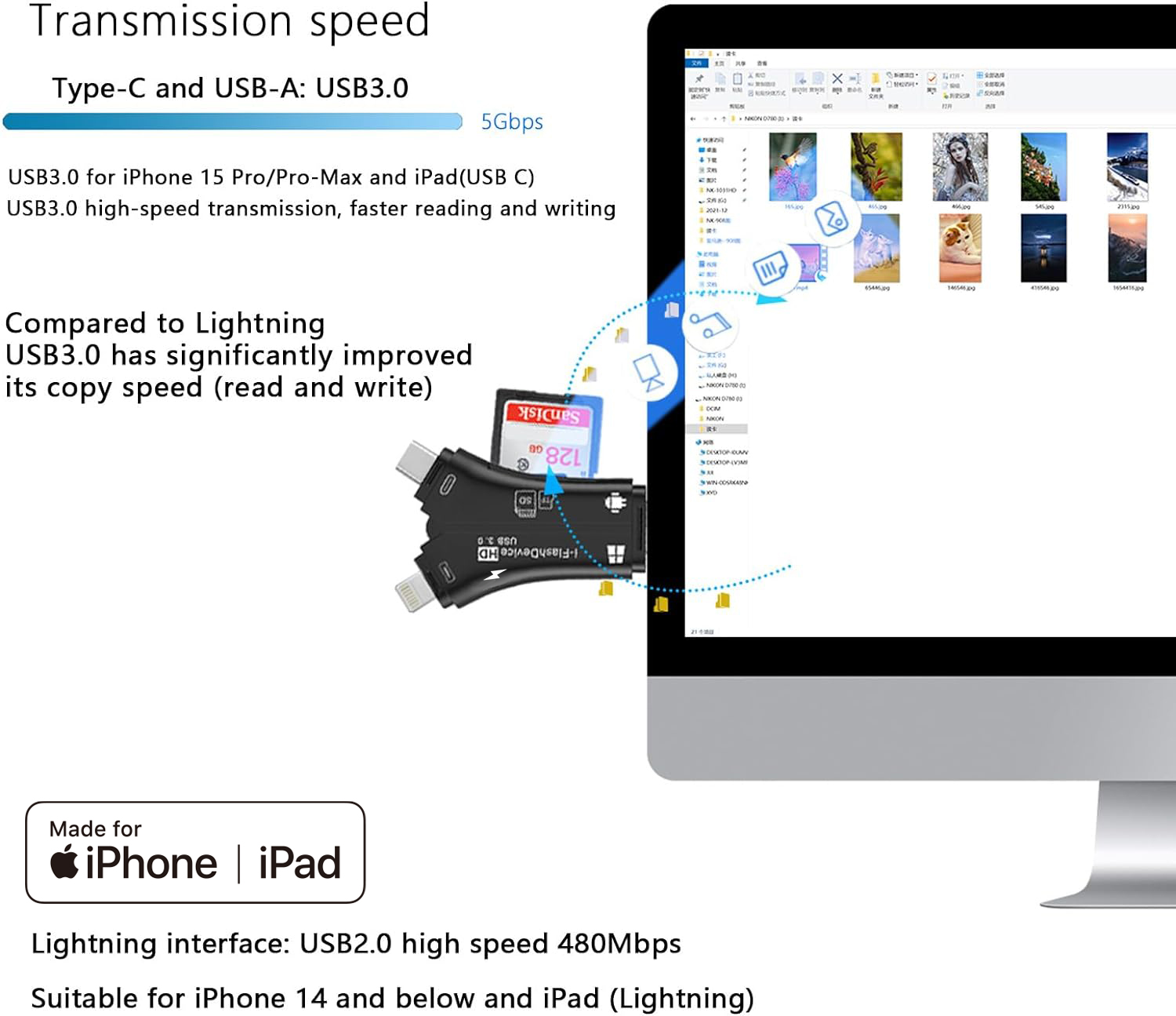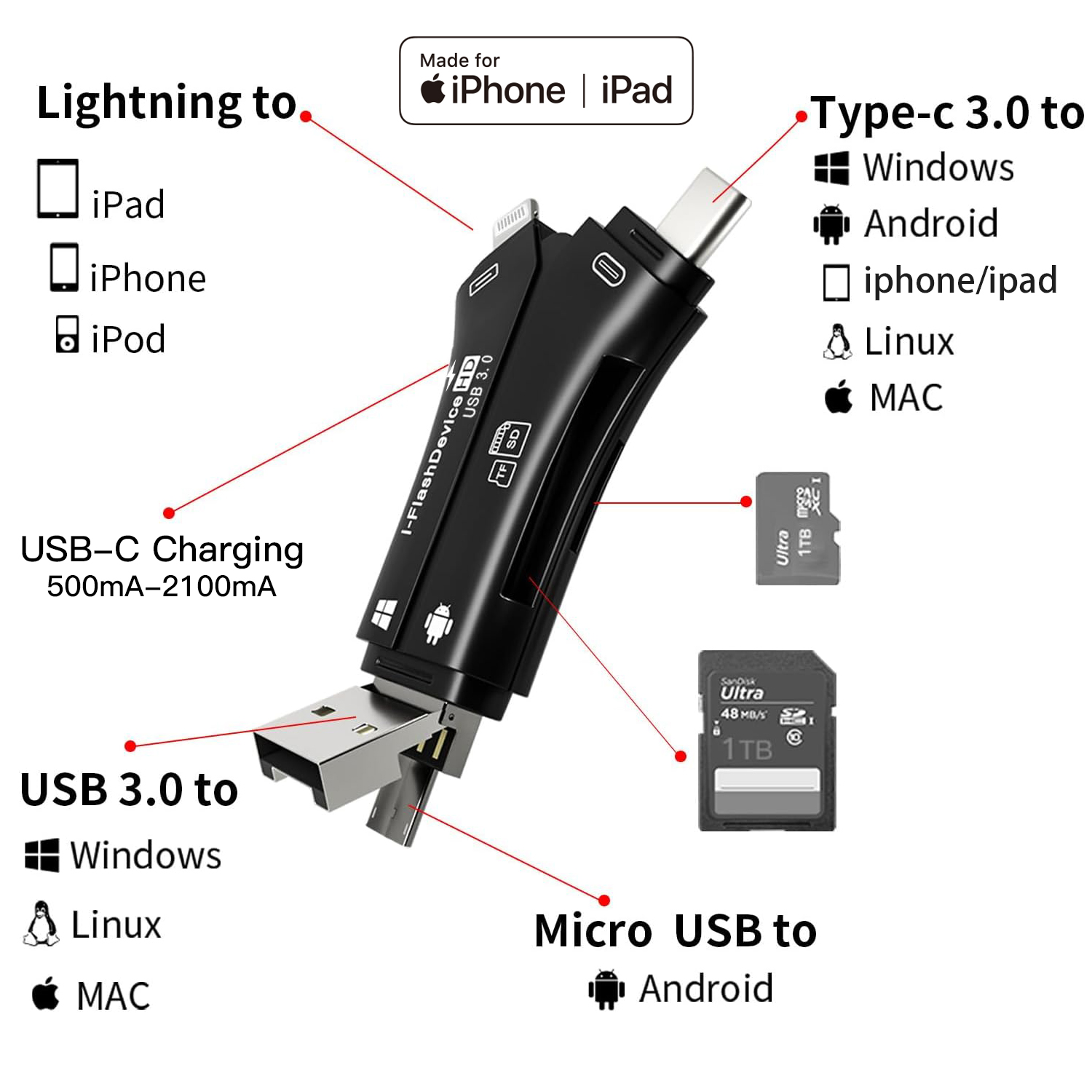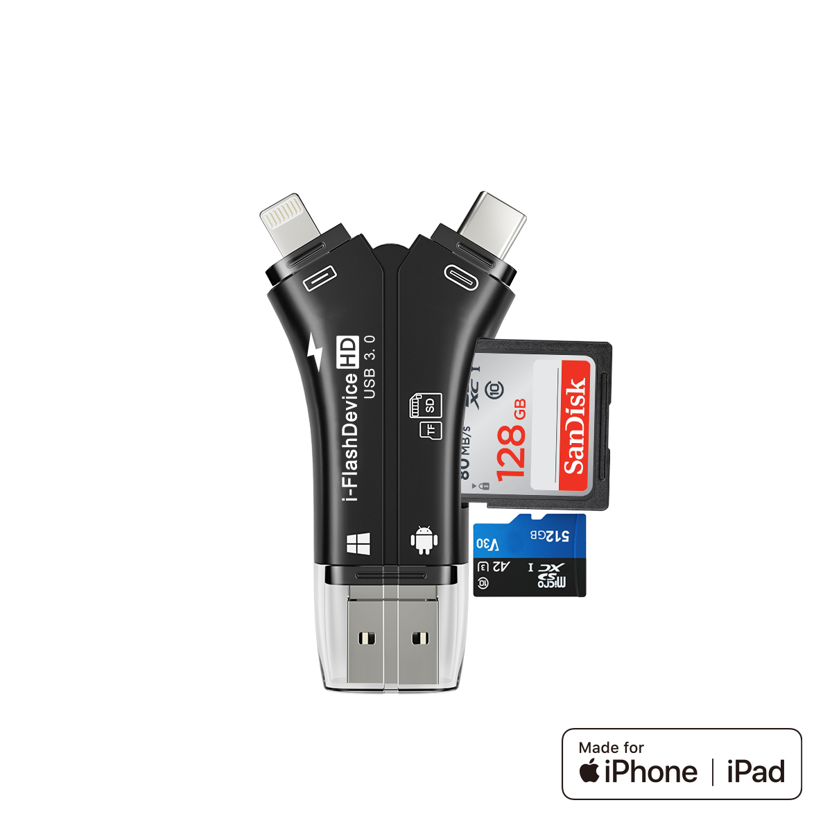 As a professional digital accessories provider, ZOIOT presents this 4-in-1 USB 3.0 SD/TF card reader, designed for seamless cross-device data management. Featuring Lightning, USB-A 3.0, USB-C 3.0, and Micro USB interfaces, plus dual SD/TF card slots (supports up to 1TB), it delivers high-speed transmission (USB 3.0 up to 5Gbps, Lightning up to 480Mbps) for efficient file transfer. Compatible with iOS, Android, Windows, Mac, and Linux, it offers plug-and-play convenience: iOS users manage data via the "i-FlashDevice" APP, while Android/PC users enable OTG for direct access. Its compact design and USB-C charging port make it ideal for photographers, travelers, and professionals, simplifying memory card reading, file backup, and media playback across all devices.